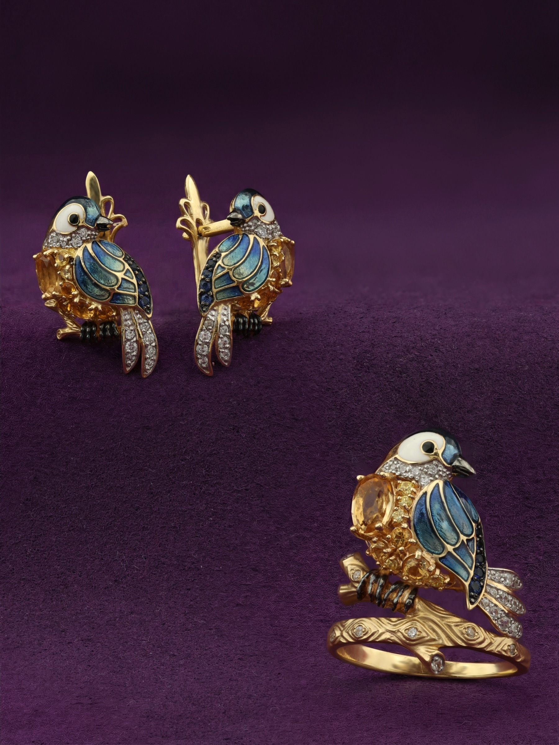 Роскошная композиция дополнена россыпью из 46 вставок, среди которых благородный сапфир синего цвета, сияющий фианит и теплый цитрин. Такое сочетание материалов создает игру света и цвета: желтые оттенки цитрина гармонично контрастируют с глубокими синими тонами сапфиров и эмали. Форма вставок круг и овал гармонично вписана в общую структуру изделия, создавая целостную и завершенную ювелирную композицию.