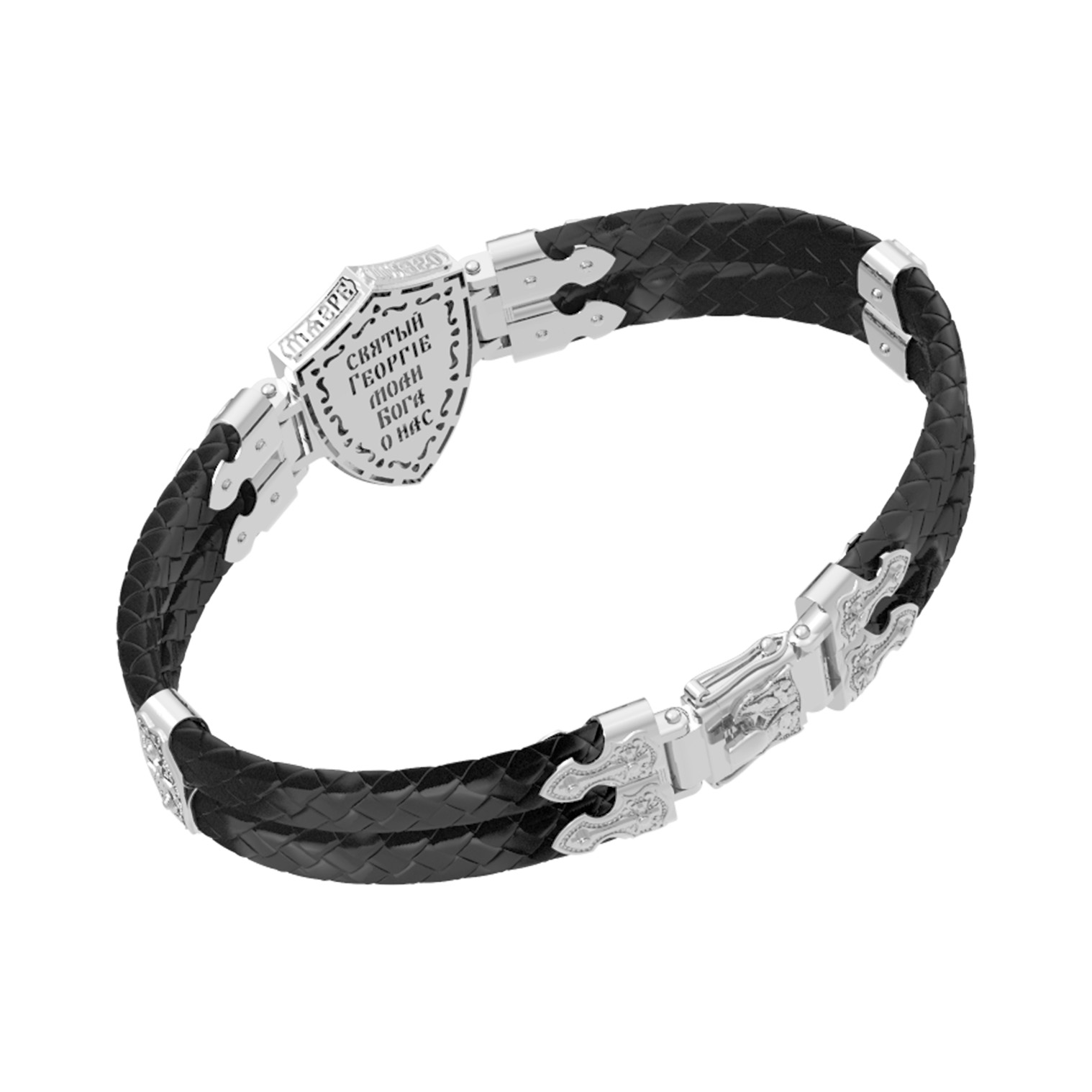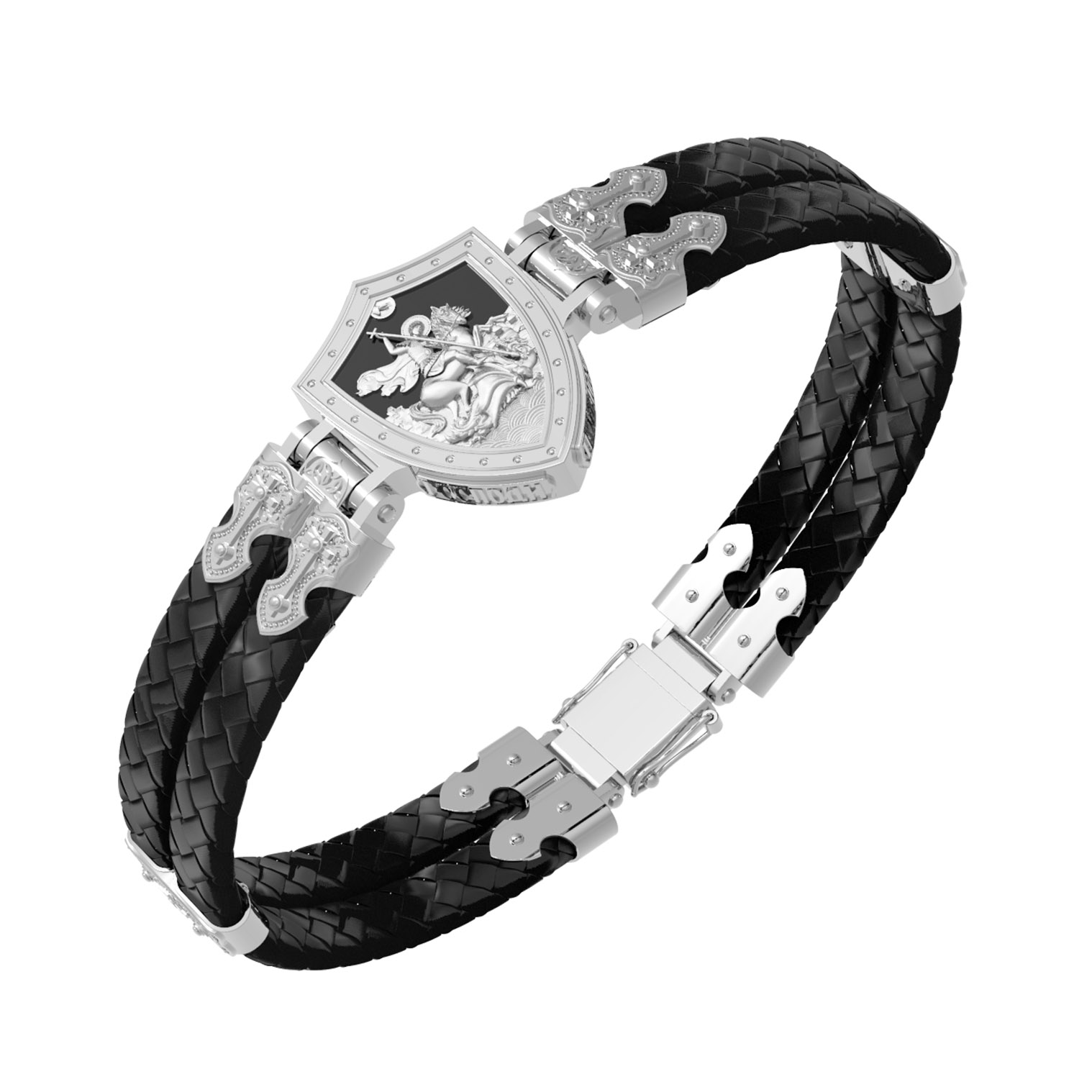 Основой композиции лицевой стороны браслета является изображение Святого Великомученика Георгия Победоносца — одного из самых почитаемых и удивительных святых. Георгий родился в Каппадокии (Малая Азия) в семье богатых и знатных горожан. Юношей поступил на службу к римскому императору Диоклетиану, за отличное знание военного дела и проявленную в боях и походах храбрость был приближен к императору и удостоен высокого воинского звания. Во время начавшихся гонений на христиан, перешел на сторону гонимых и, отвергнув человеческий страх, стал ярым проповедником учения Христа. Мучители подвергли опального воеводу жесточайшим восьмидневным пыткам и казнили его (обезглавили) в возрасте около тридцати лет в 303 году. На Руси он известен как Юрий или Егорий, заступник для верующих, чья жизнь имеет какое-либо отношение к военным делам, помощник в крестьянском труде. Браслет сделан в виде воинского щита. На нем Георгий изображен как воитель, сидящий на вздыбленном коне и поражающий копьем огнедышащего змея. Над образом изображена благословляющая Божия десница. Змей символизирует собою сатанинские силы. Молитвами вознесенными к Всевышнему и своей непреклонной верой он смог одолеть чудовище. Святой убил змея, спас царскую дочь, принесенную в жертву, и жителей города, их души от влияния дьявола, породив в них надежду и веру в Господа, призывая людей принять христианскую веру. На торце изделия помещена молитва: «Господи, помилуй мя грешного».