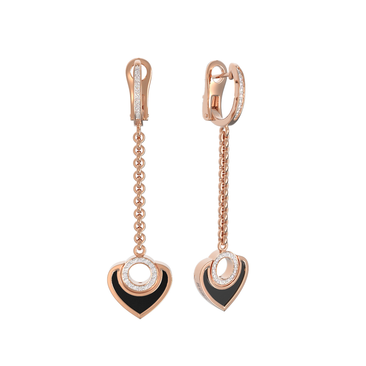 Роскошный блеск красного золота дополнен контрастной игрой вставок: глубокий черный оникс в форме сердца изысканно сочетается с сияющими белыми бриллиантами круглой огранки. Всего в изделии использовано 50 драгоценных камней, которые создают эффектное мерцание при каждом движении. Длинные цепочки добавляют динамики, визуально удлиняя линию шеи и привлекая внимание к лицу.