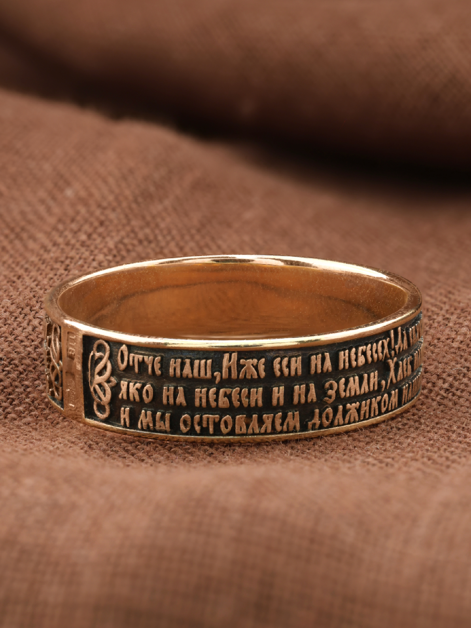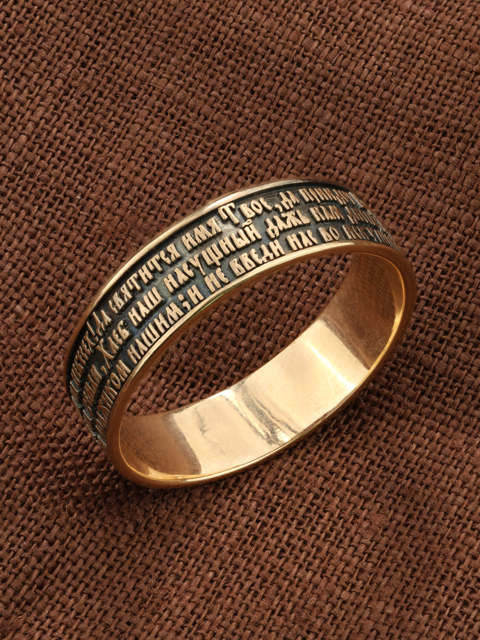 На лицевой стороне кольца отображена Божественная молитва к Богу Отцу, которую, Господь Иисус Христос дал своим ученикам. Молитва Господня приводится в Евангелиях в двух вариантах, более пространном в Евангелии от Матфея и кратком — в Евангелии от Луки. Различны и обстоятельства при которых Христос произносит текст молитвы. В Евангелии от Матфея «Отче наш» входит в состав Нагорной проповеди. Евангелист Лука пишет, что апостолы обратились к Спасителю: «Господи! Научи нас молиться, как и Иоанн научил учеников своих » (Лк. 11, 1). «Отче наш, Иже еси на небесе? х! Да святится имя Твое, да прии? дет Царствие Твое, да будет воля Твоя, яко на небеси? и на земли?. Хлеб наш насущный да? ждь нам дне? сь; и оста? ви нам до? лги наша, якоже и мы оставляем должнико? м нашим; и не введи нас во искушение, но изба? ви нас от лукаваго.»
