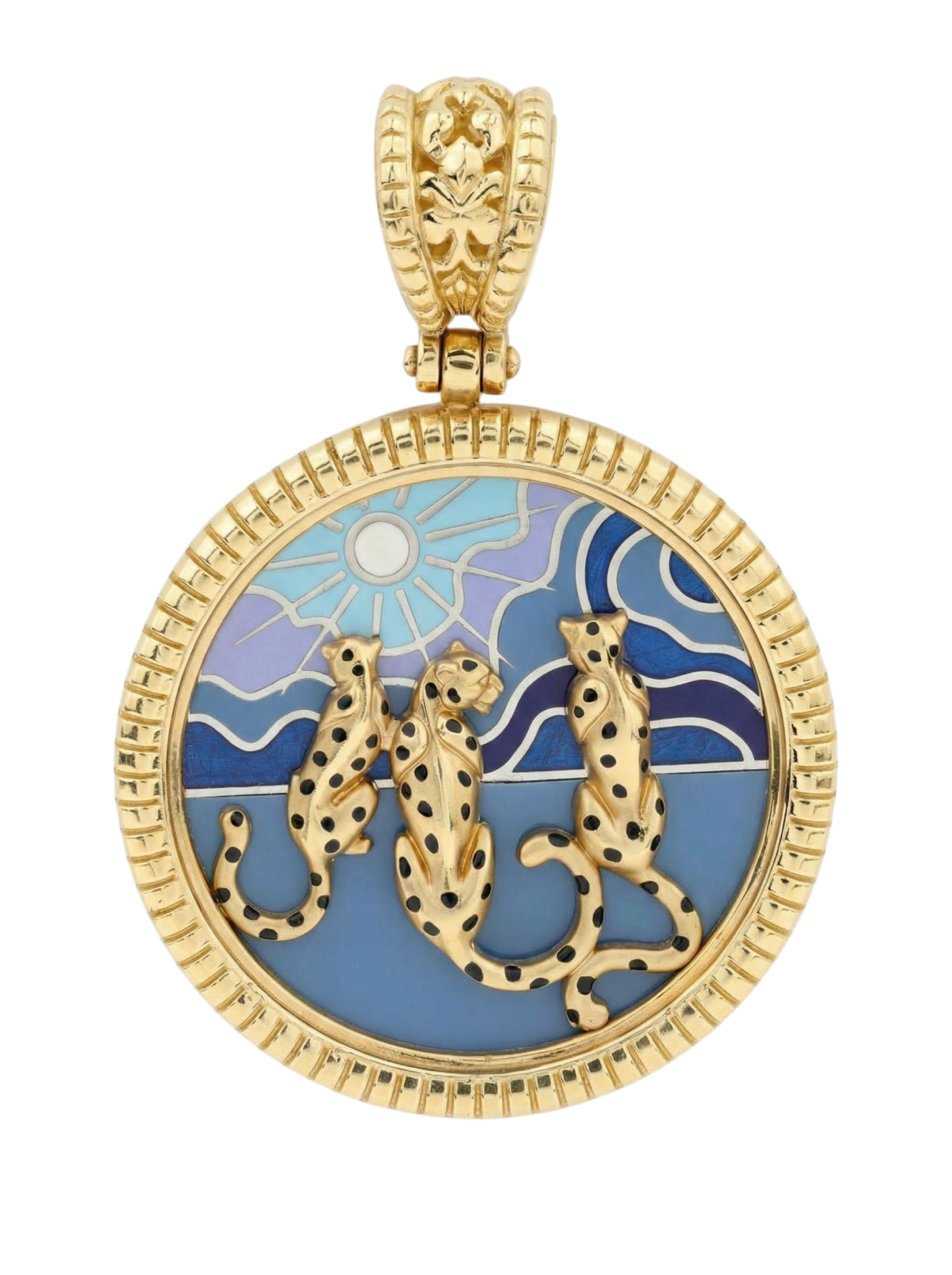 Подвеска из лимонного золота с эмалью — это выразительное украшение, которое станет ярким акцентом вашего образа. Изделие выполнено из качественного лимонного золота 585 пробы, обладающего благородным, солнечным оттенком. Дизайнерское решение в виде грациозных леопардов превращает украшение в миниатюрное произведение искусства. На круглой основе запечатлен живописный сюжет с хищниками на фоне стилизованного пейзажа, где небо и горизонт переданы через глубокую палитру разноцветной эмали.