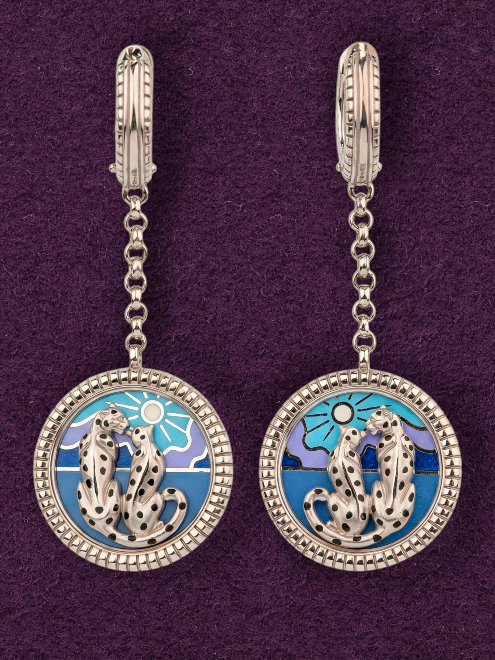 Эффектные серьги из белого золота 585 пробы — это воплощение ювелирного искусства, вдохновленное грацией дикой природы. Украшение входит в авторскую серию De luxe Premium — Леопарды — рассвет и закат и привлекает внимание своим уникальным дизайном: в центре круглых подвесок расположена выразительная фигура леопарда, выполненная с ювелирной точностью. Изящный хищник вписан в атмосферный пейзаж рассвета и заката, переданный с помощью техники эмали. Контрастные оттенки разноцветной эмали создают глубину и игру света, подчеркивая благородный холодный блеск белого золота.
