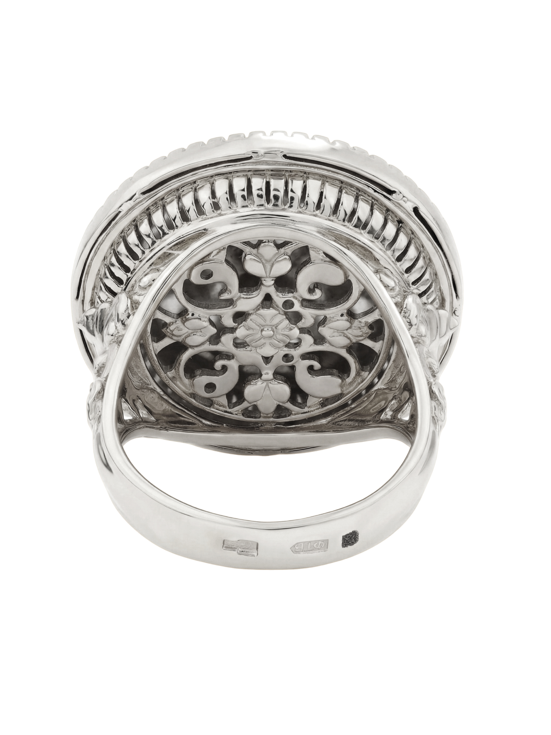 Белое золото холодного оттенка подчеркивает благородство композиции, создавая идеальный фон для эмалевой вставки. Массивная округлая форма кольца придает изделию солидный и статусный вид, делая его гармоничным дополнением как женского, так и мужского образа. Универсальность исполнения позволяет носить данную модель самостоятельно или дополнить ее другими украшениями из этой серии, создав законченный гарнитур.