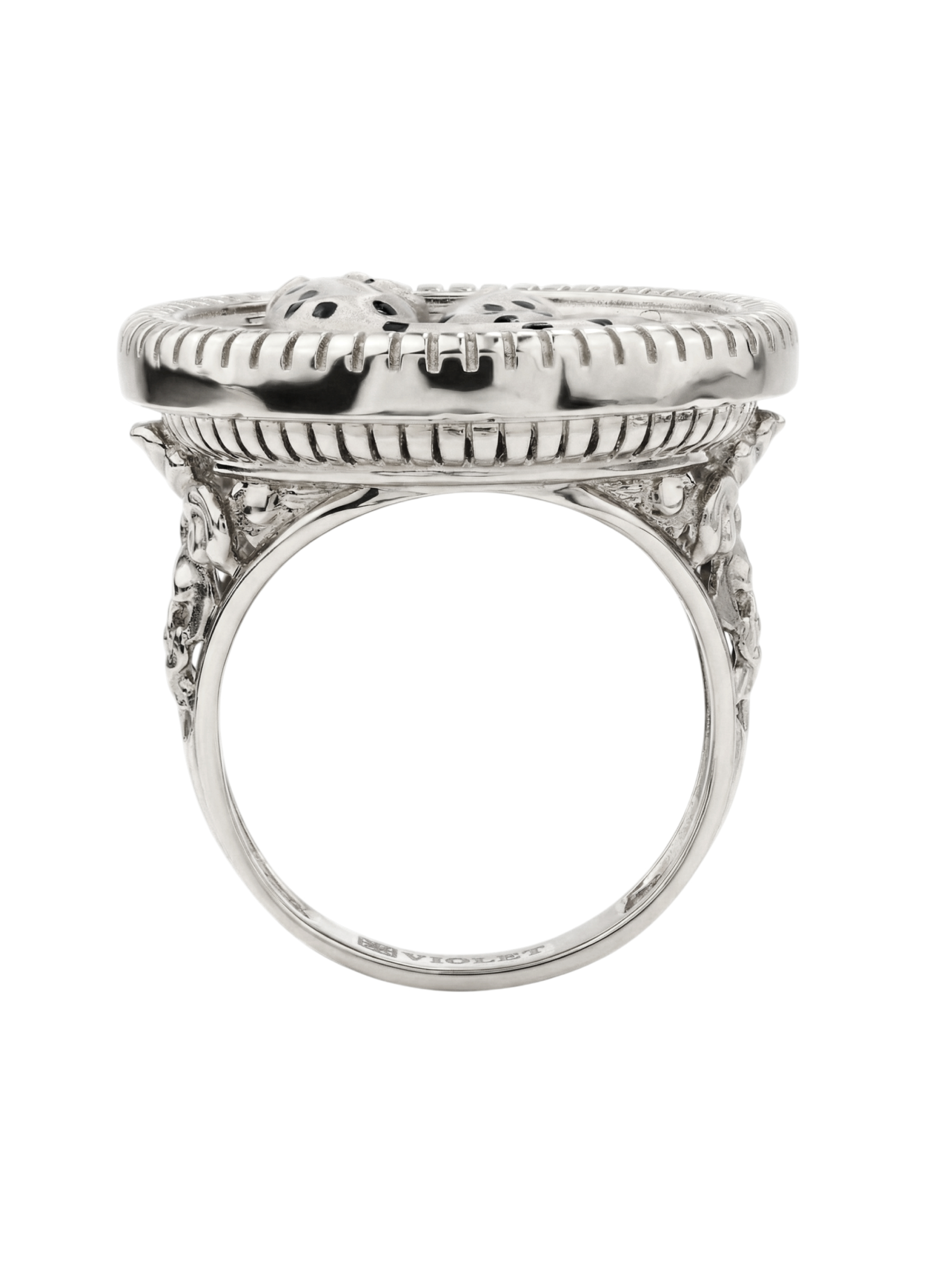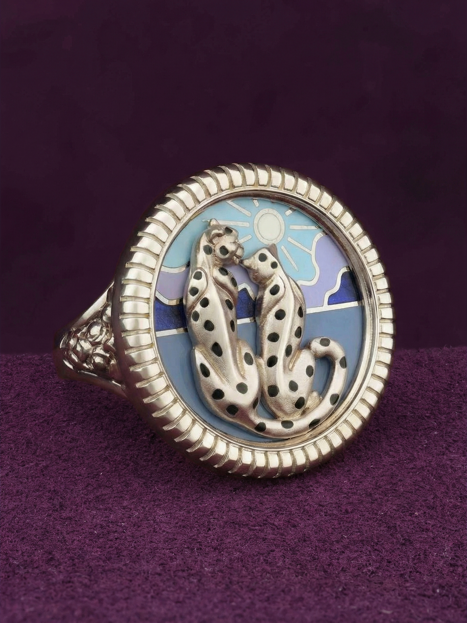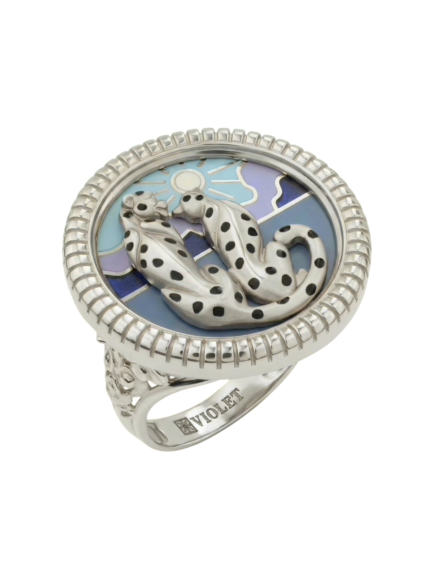 Кольцо из белого золота 585 пробы из коллекции De luxe Premium — Леопарды — рассвет и закат — это воплощение ювелирного искусства, созданное для тех, кто ценит эстетику и смелые художественные решения. Центральным элементом украшения выступает искусная миниатюра с изображением грациозных леопардов, выполненная с использованием яркой разноцветной эмали. Детализированный дизайн передает всю динамику и пластику этих диких кошек, превращая аксессуар в настоящий арт-объект на вашем пальце.
