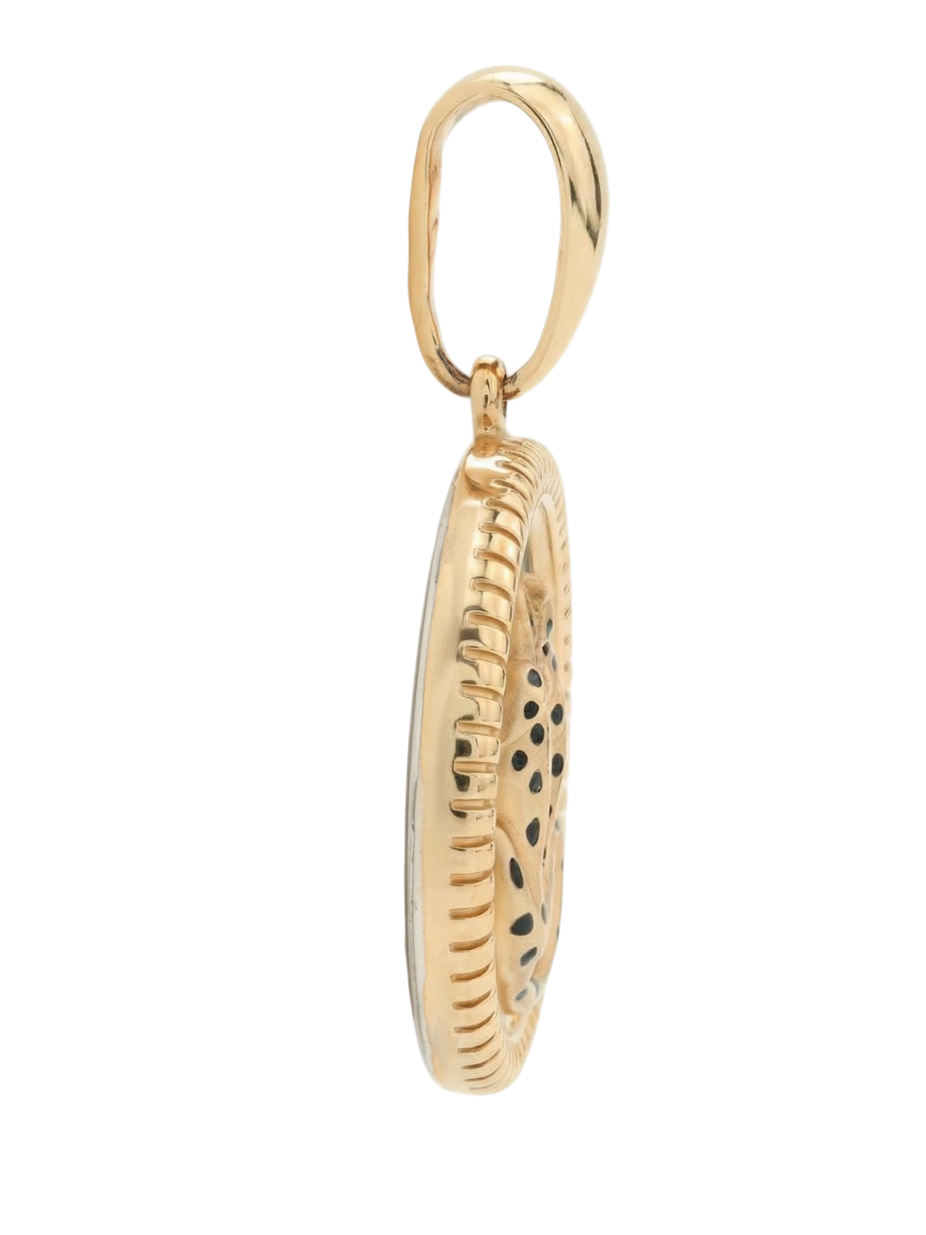 Особую художественную выразительность украшению придает разноцветная эмаль, создающая живописный фон в виде рассвета или заката. Сочетание теплых оттенков эмали и блеска драгоценного металла превращает подвеску в настоящий арт-объект. Круглая форма изделия с рифленым кантом делает его гармоничным дополнением как повседневного, так и вечернего гардероба.