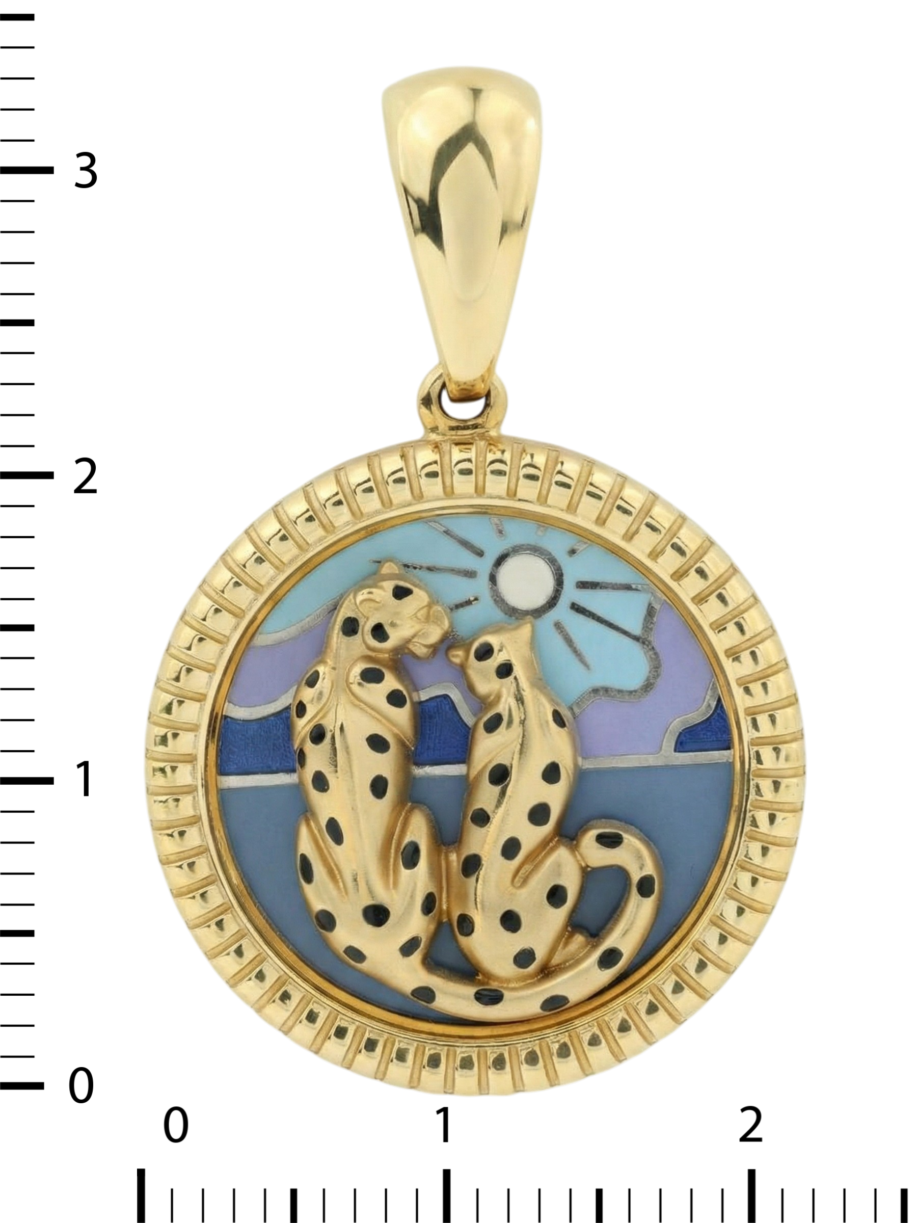 Элегантная подвеска из лимонного золота 585 пробы станет выразительным акцентом вашего образа. Изделие выполнено в рамках изысканной серии De luxe Premium — Леопарды — рассвет и закат, воплощающей грацию и природную красоту. Центром композиции является искусный дизайн с изображением двух леопардов — символа уверенности и силы. Фигуры хищников, выполненные из благородного лимонного золота, гармонично сочетаются с яркой художественной эмалью, создающей живописный фон в виде рассвета или заката.