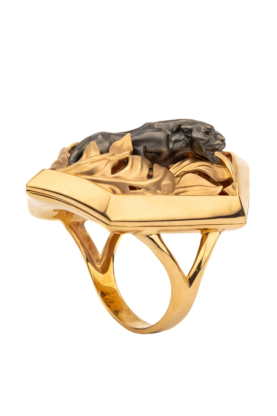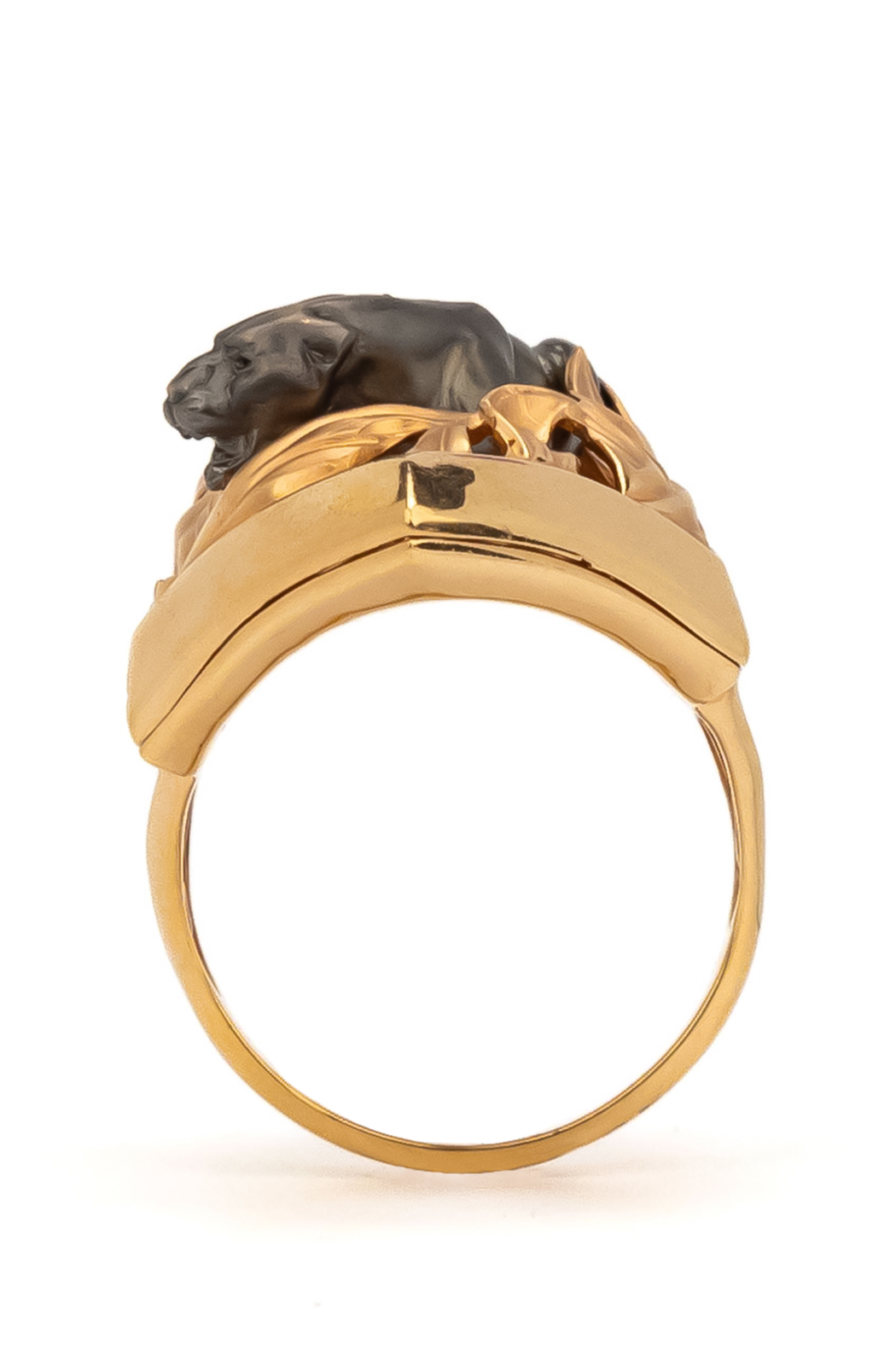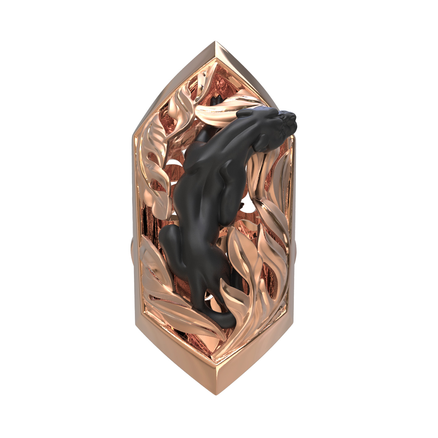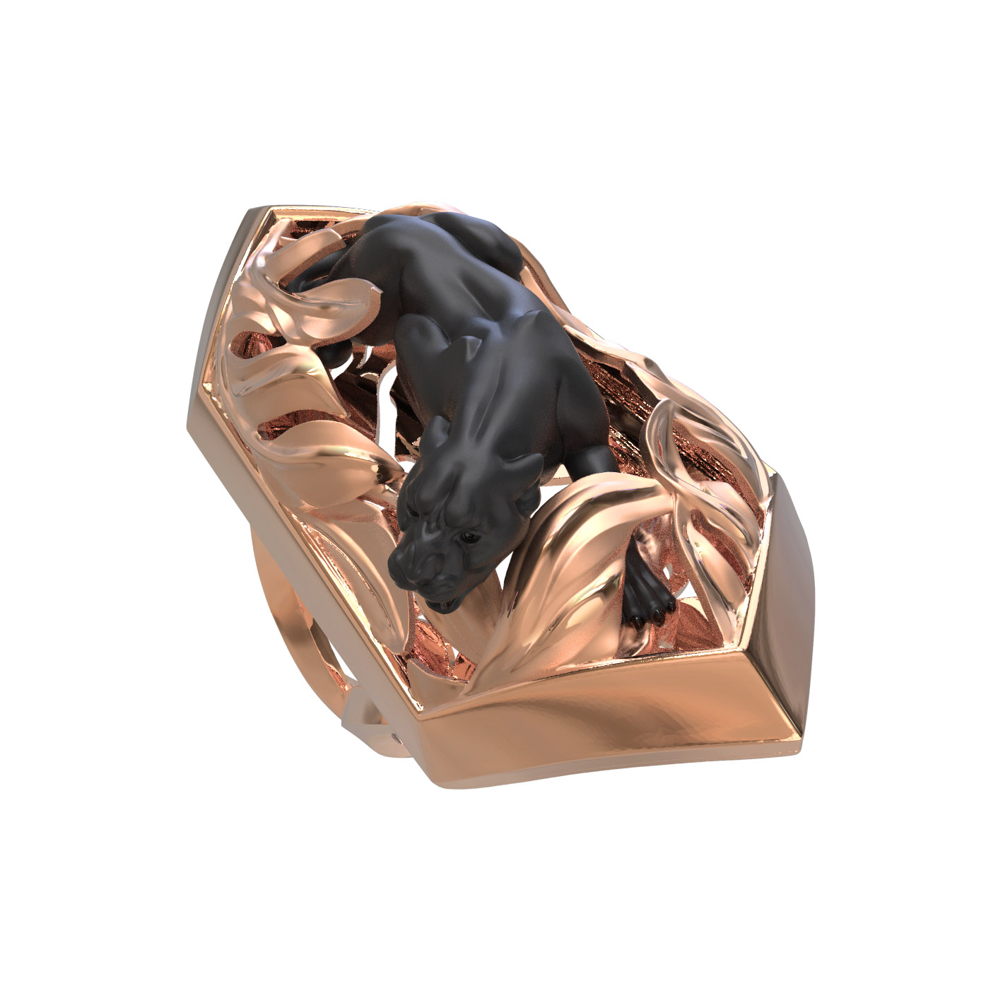 Основа кольца выполнена из красного золота 585 пробы, что обеспечивает изделию благородный теплый оттенок и долговечность. Контрастное исполнение — сочетание блеска красного золота и темного силуэта пантеры — придает аксессуару объем и особую выразительность. Дизайн с элементами растительного декора вокруг фигуры хищника создает гармоничную композицию, которая одинаково эффектно смотрится на руке.