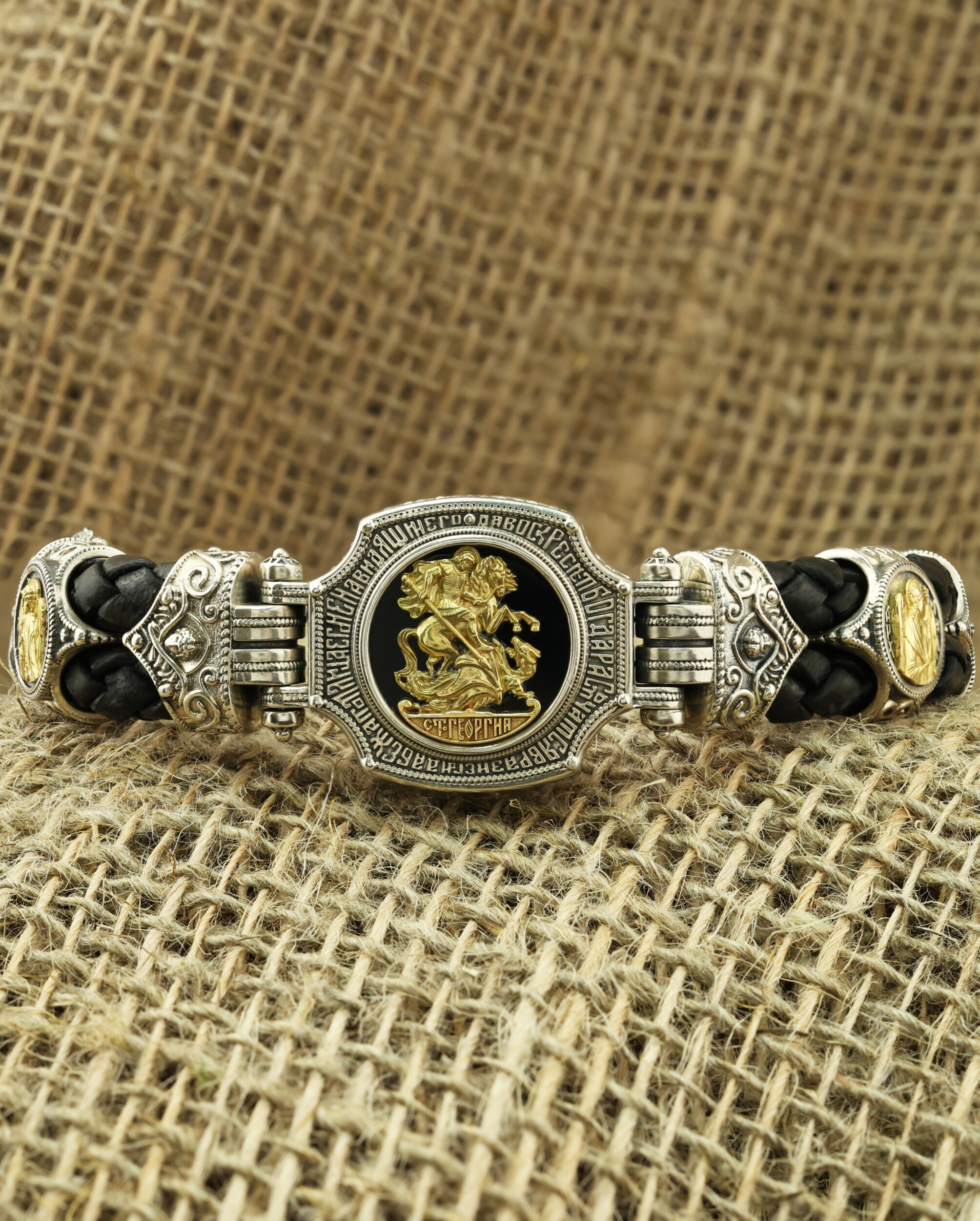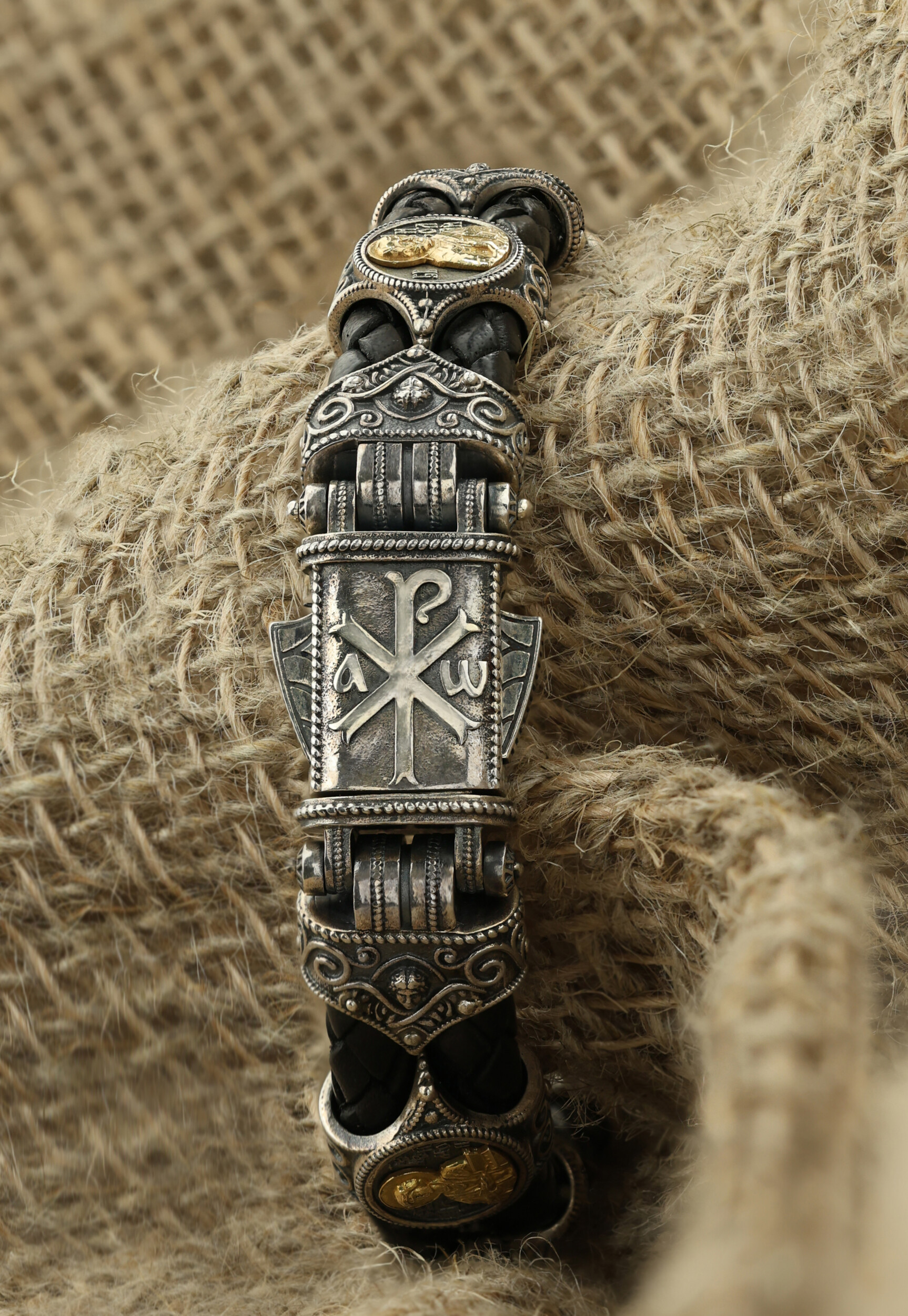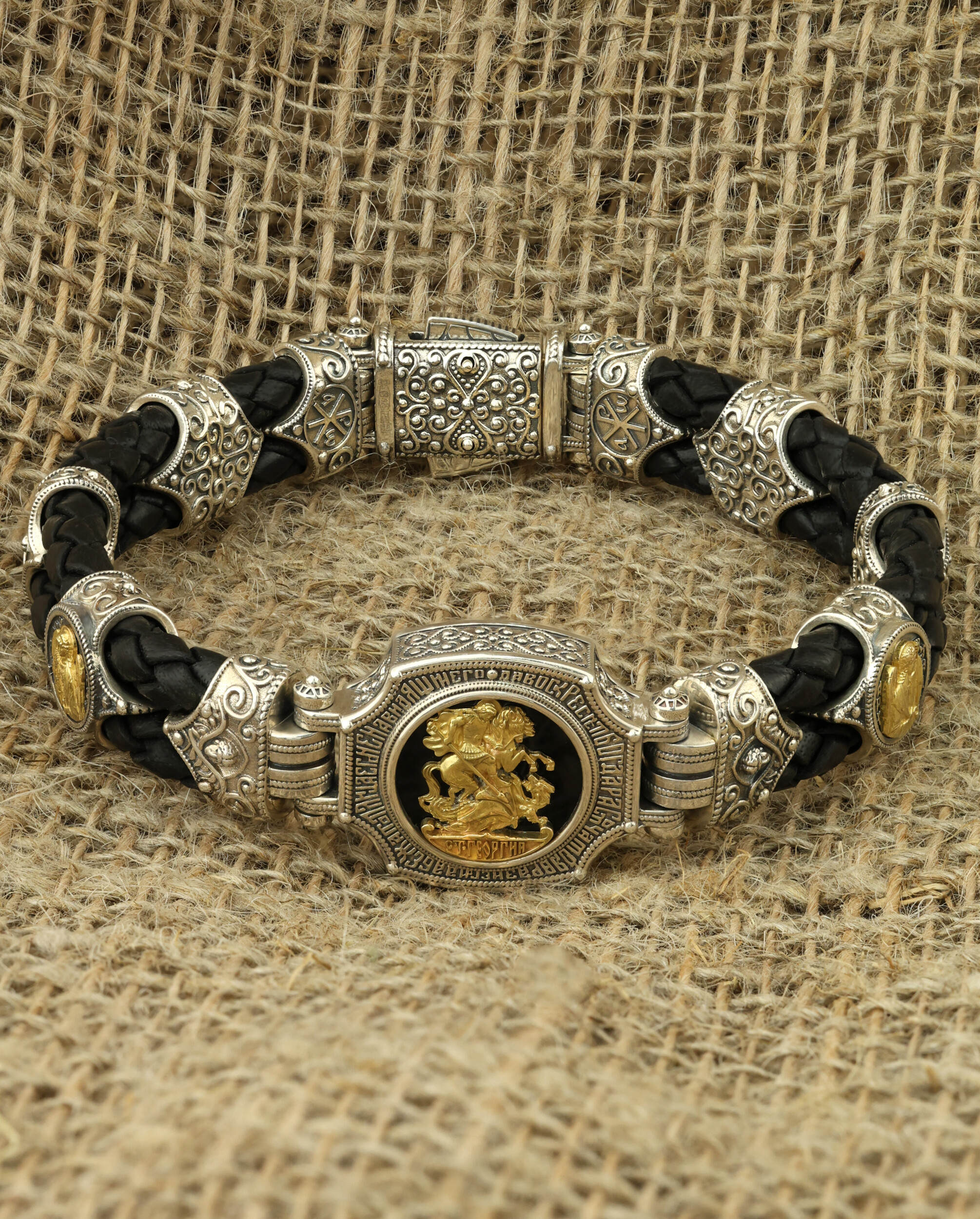Браслет из серебра 925 пробы и золота 750 пробы c кожаным шнурком и ониксом