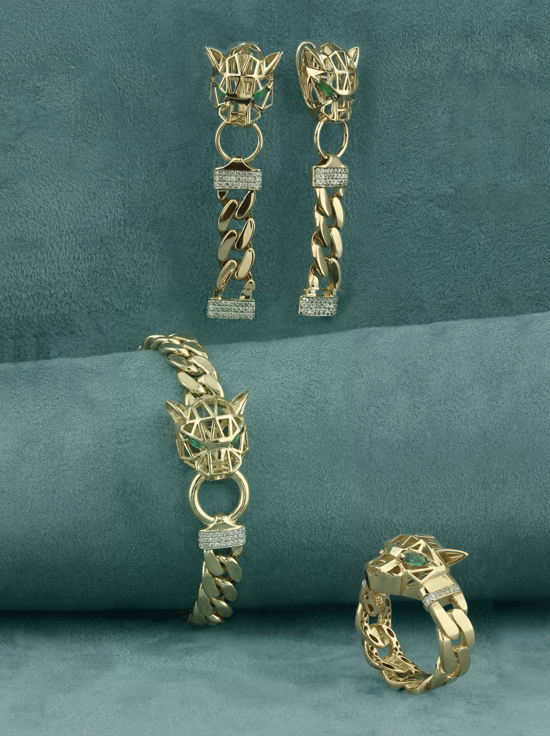 Центральный элемент композиции — пронзительный взгляд дикого зверя, который формируют изумруды глубокого зелёного цвета в огранке маркиз. В дополнение к ним в отделке использованы 18 вставок из сверкающих бриллиантов круглой огранки, которые добавляют изделию благородного блеска. Тонкое сочетание лимонного золота и классической палитры камней делает этот аксессуар поистине роскошным.