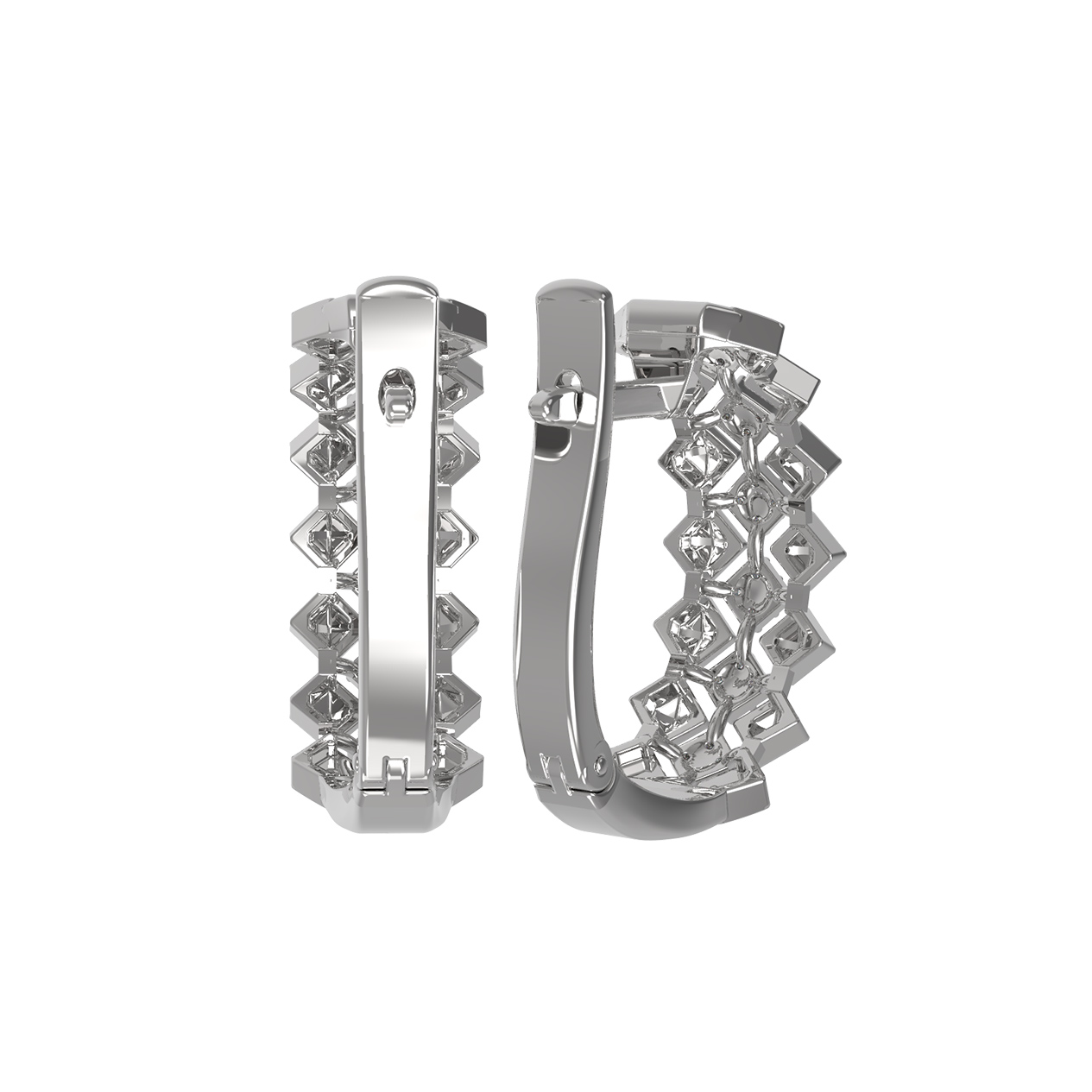 Эффектные серьги из белого золота 585 пробы — яркий образец ювелирного мастерства из коллекции De Luxe Бриллианты — Pyramids. Геометрическая эстетика пирамидальных элементов создает динамичный и современный образ, притягивающий взгляды своей строгостью и блеском. Контрастное сочетание четких граней драгоценного металла и мерцания камней делает это украшение универсальным аксессуаром, подходящим как для женщин, так и для мужчин.