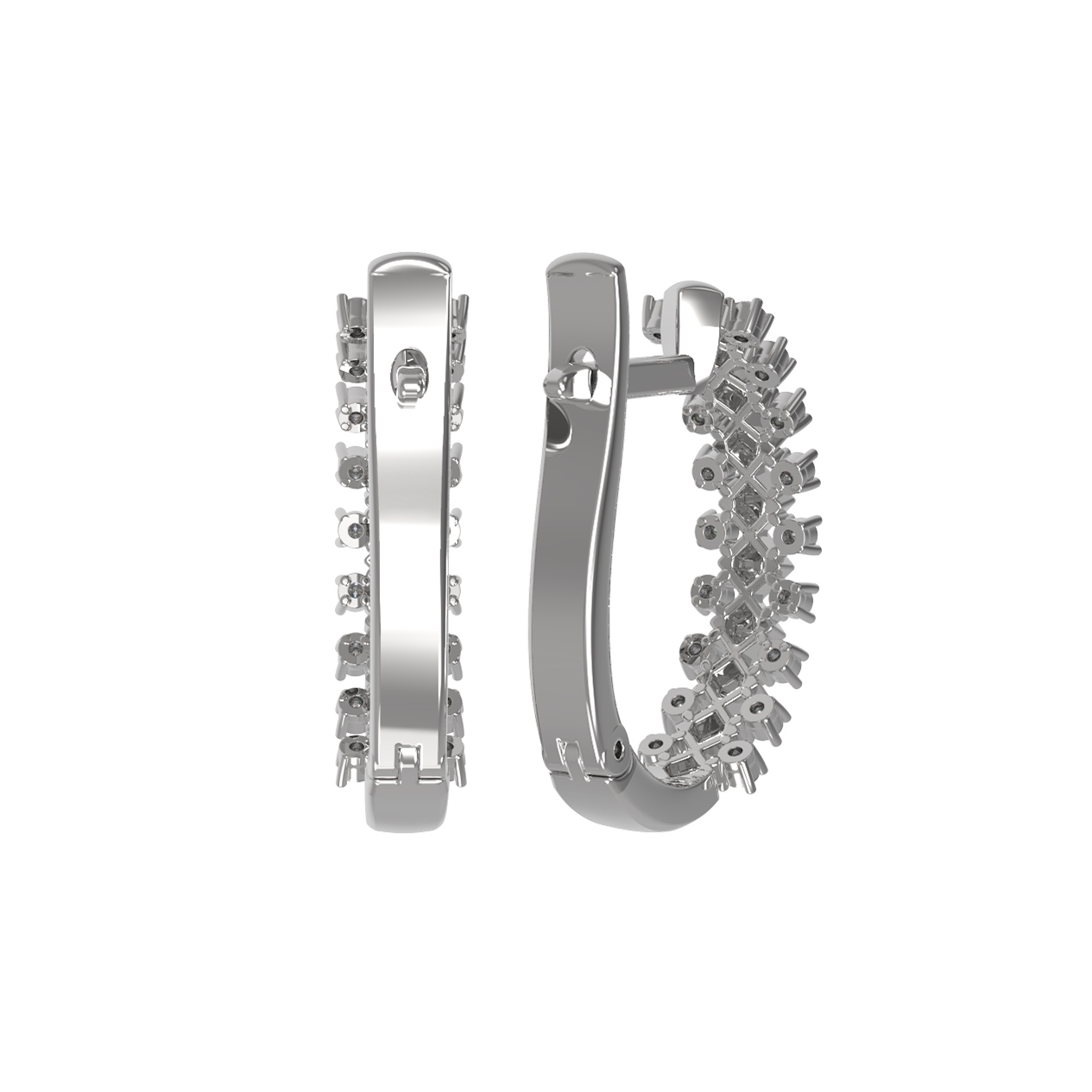 Лицевая сторона серег инкрустирована 36 бриллиантами круглой формы с классическим белым цветом вставок. Огранка камней позволяет максимально раскрыть их игру при попадании света. Геометрический орнамент, напоминающий пирамидальные структуры, придает украшению современный вид и динамику. Белое золото холодного оттенка служит идеальной оправой для сверкающих бриллиантов, усиливая их чистоту и сияние.