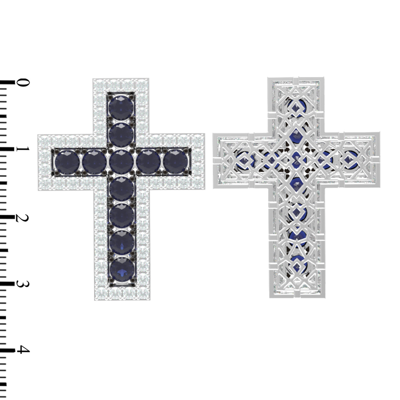 Композиция украшена 63 вставками круглой формы: благородными сапфирами синего цвета и сверкающими бриллиантами белого цвета. Контрастное сочетание холодного блеска металла и насыщенного оттенка сапфиров создает выразительный визуальный акцент, привлекая внимание к деталям. Тщательно продуманный дизайн делает этот крест универсальным аксессуаром, который подходит как для женщин, так и для мужчин. Благодаря своему лаконичному исполнению, изделие гармонично сочетается с другими украшениями и может стать частью изысканного ювелирного комплекта.