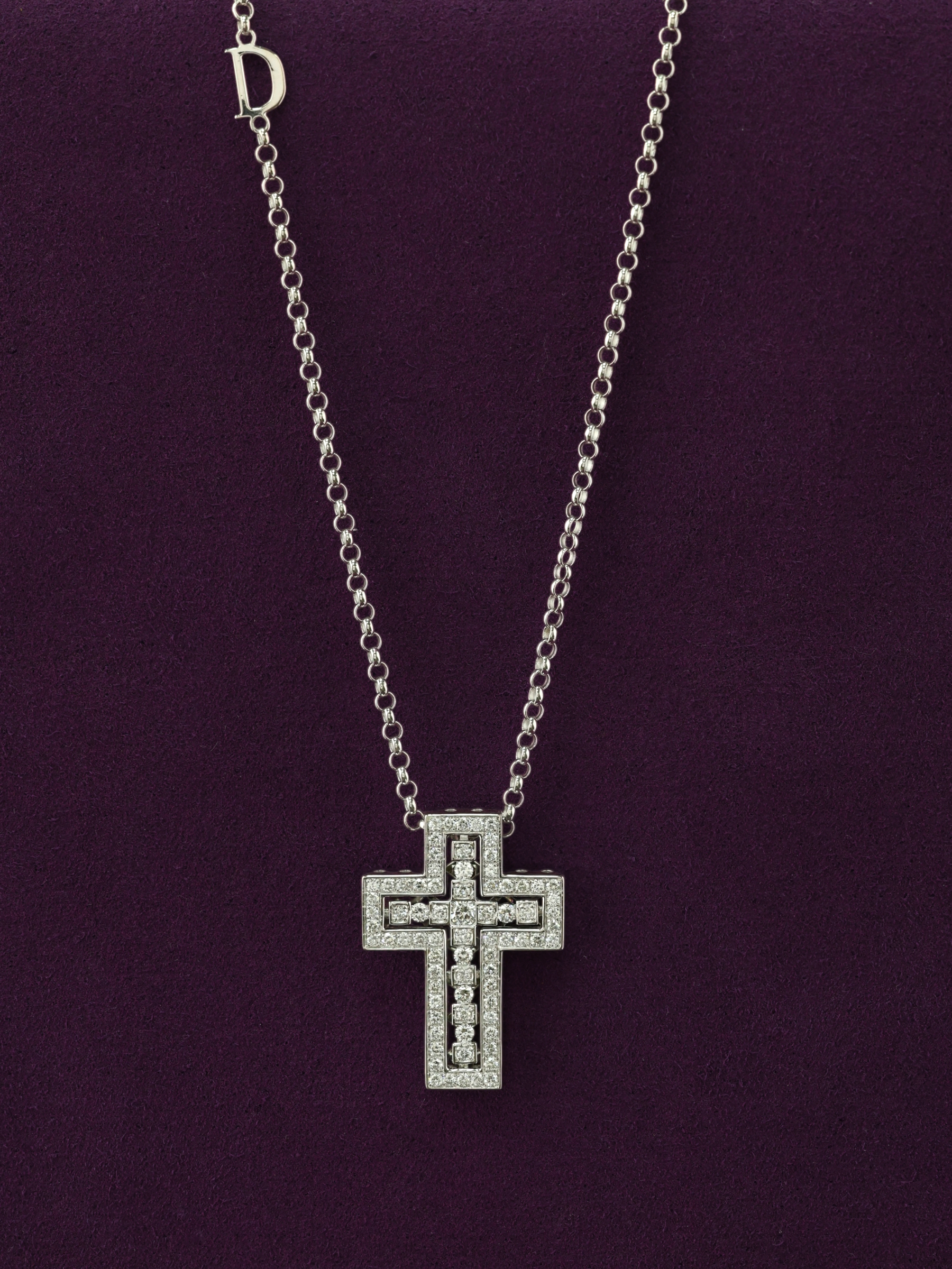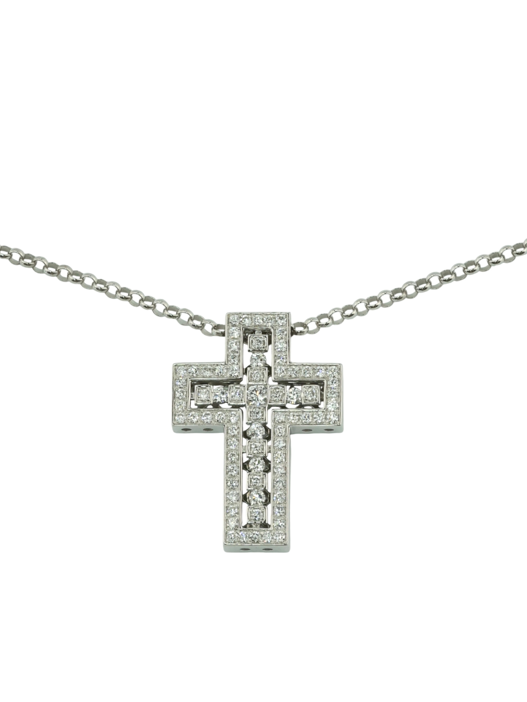 Геометрически выверенный дизайн подчеркивает холодный блеск белого золота, который идеально сочетается с роскошным сиянием камней. В оформлении изделия использованы 75 бриллиантов круглой формы с белым цветом вставок. Тщательно отобранные камни образуют завораживающий узор, создавая выразительную игру света при каждом движении. Лаконичная, но эффектная форма креста делает его универсальным украшением, способным стать центральным акцентом вашего стиля.