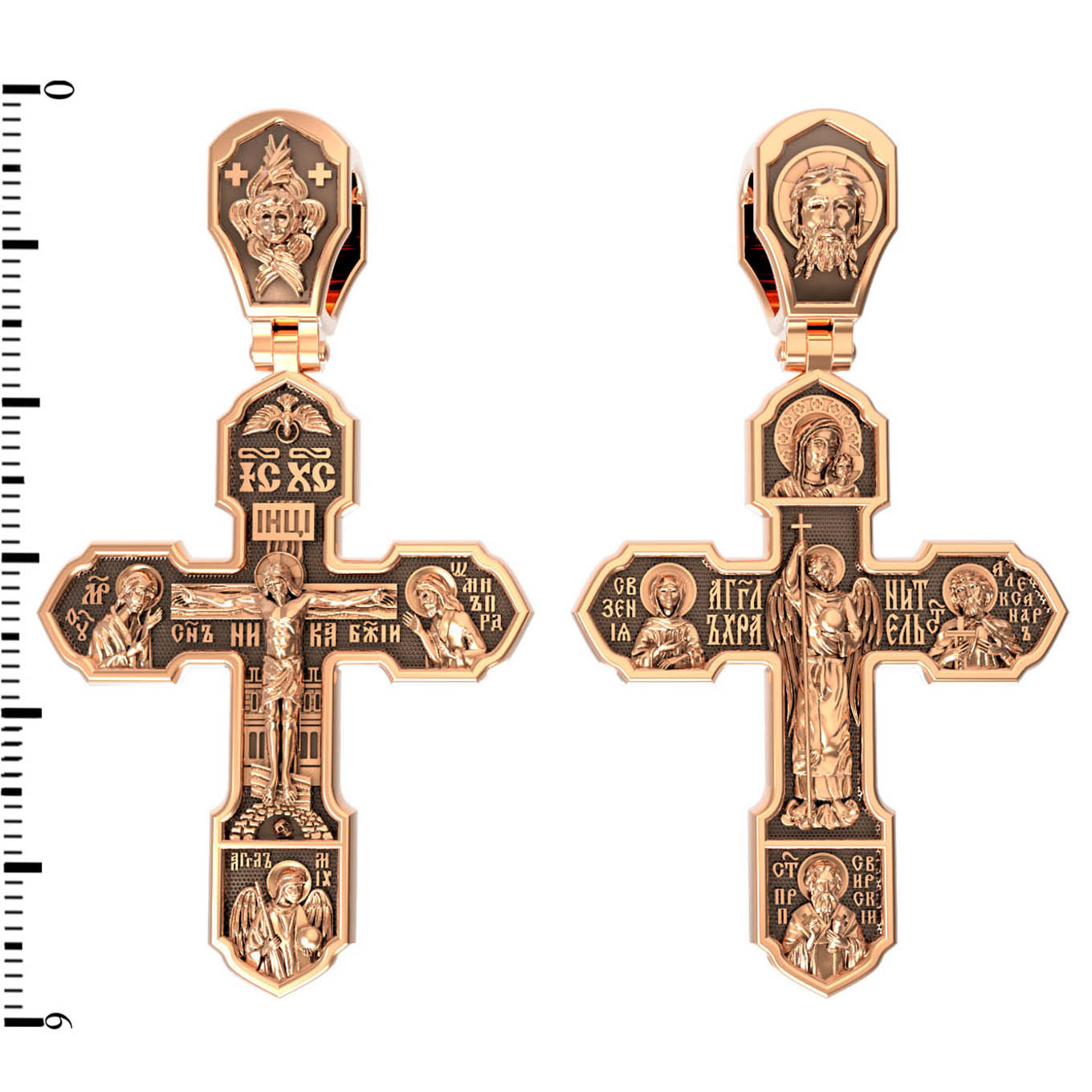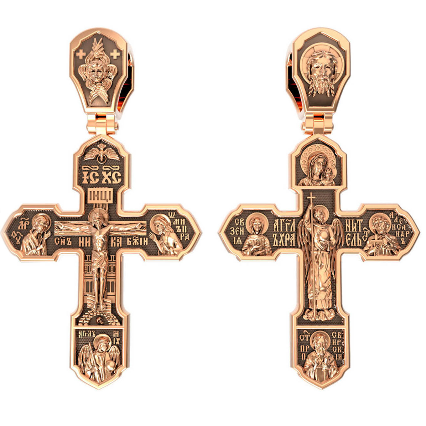 На лицевой стороне изображено Распятие Господа Иисуса Христа, над вершиной которого помещены титлы Его святого имени — «ИС ХС». Под основной перекладиной надписи — «НИКА», что в переводе с греческого означает «победитель», и словосочетание «СЫН БОЖИЙ», что означает божественную природу Иисуса Христа. С двух сторон Христу предстоят Пресвятая Богородица и св. Андрей Первозванный. Внизу — образ Архангела Михаила, могучего защитника от злых сил. Это он низверг дьявола и встал во главе ангелов для борьбы с бесовскими силами. Его имя означает «Кто яко Бог?».