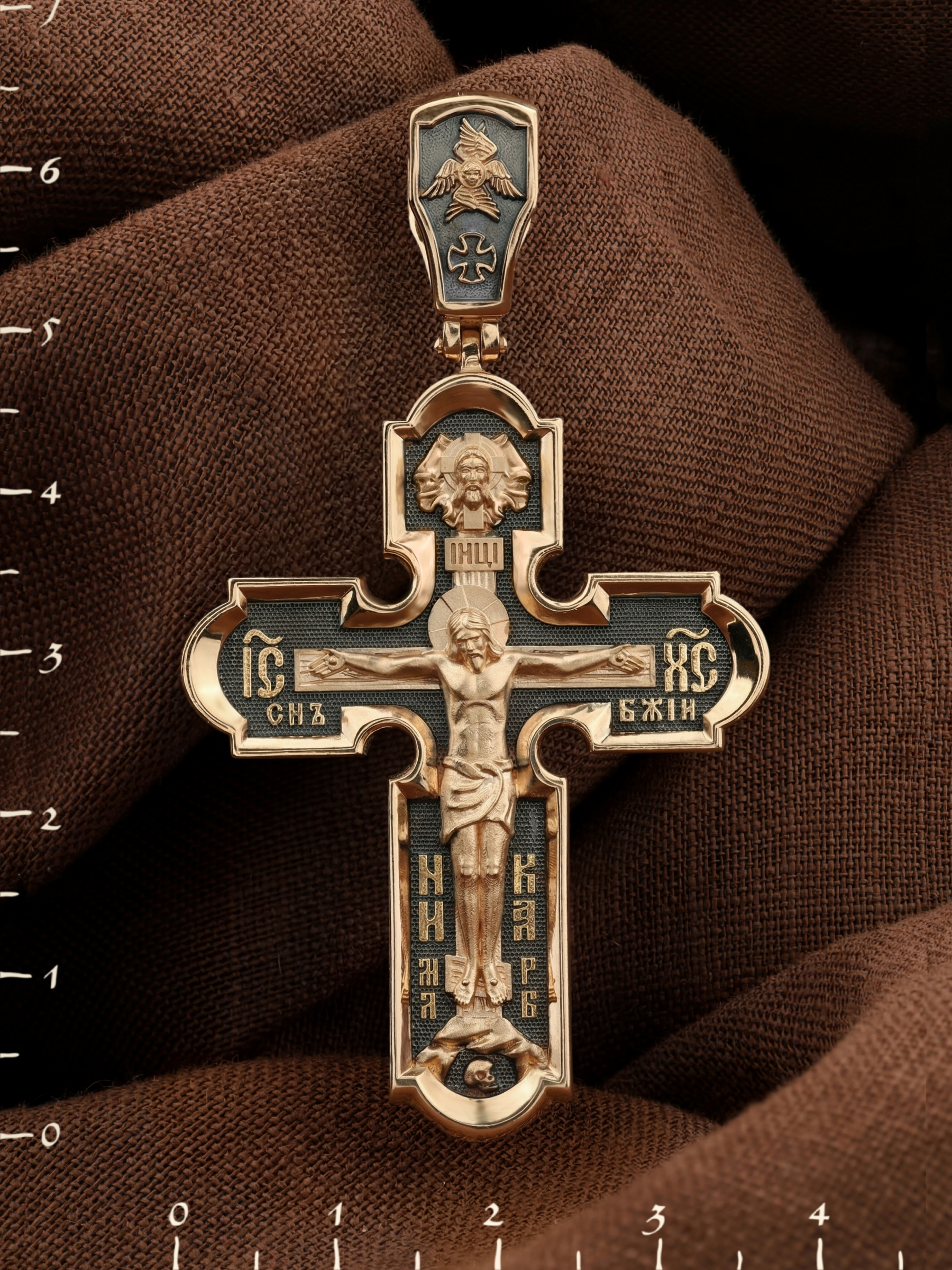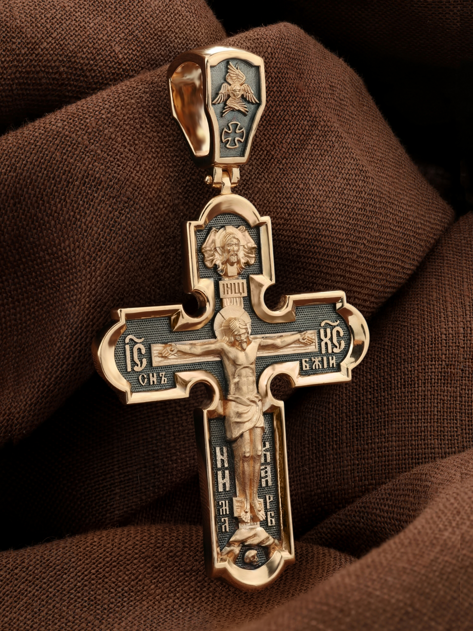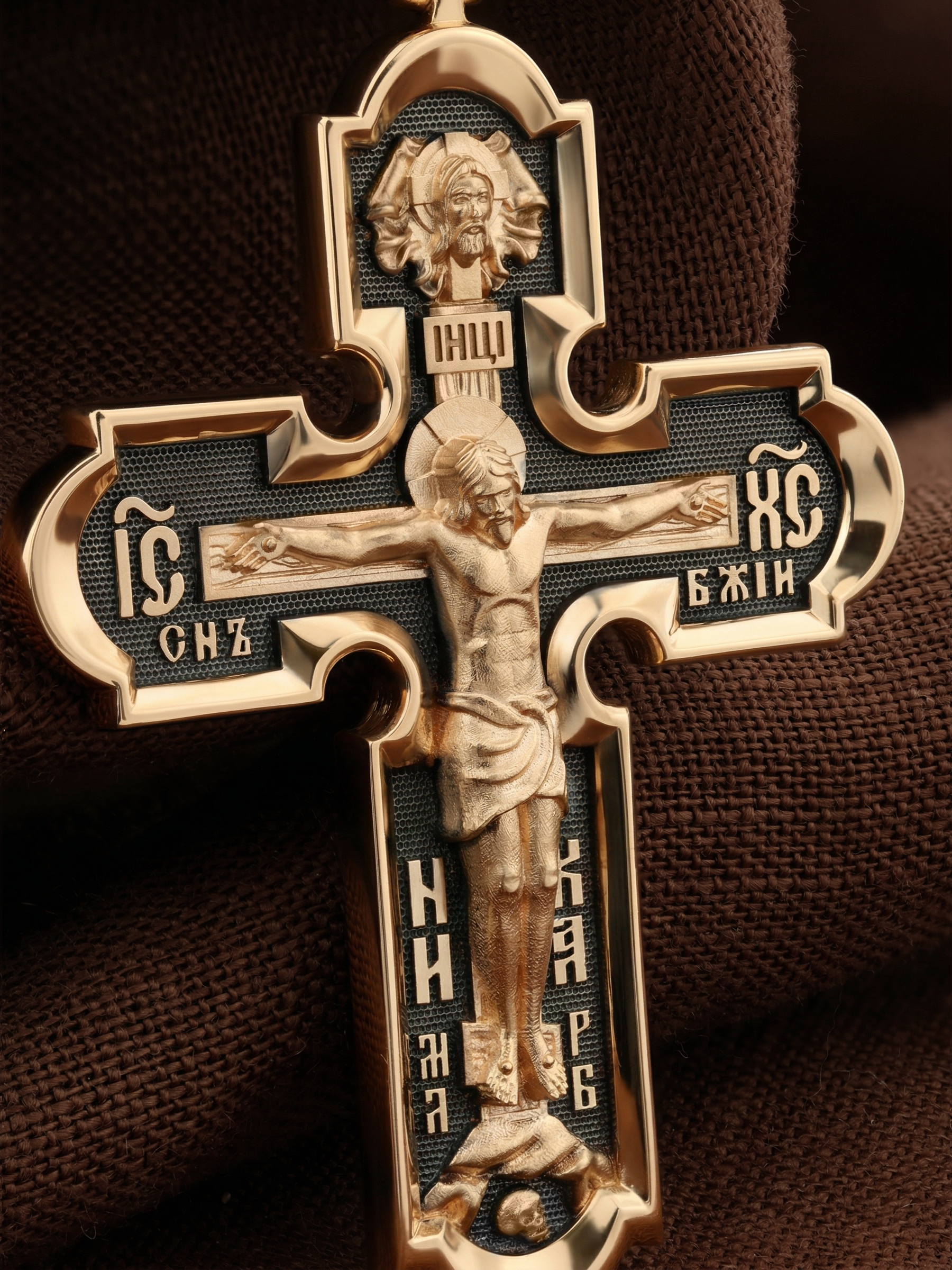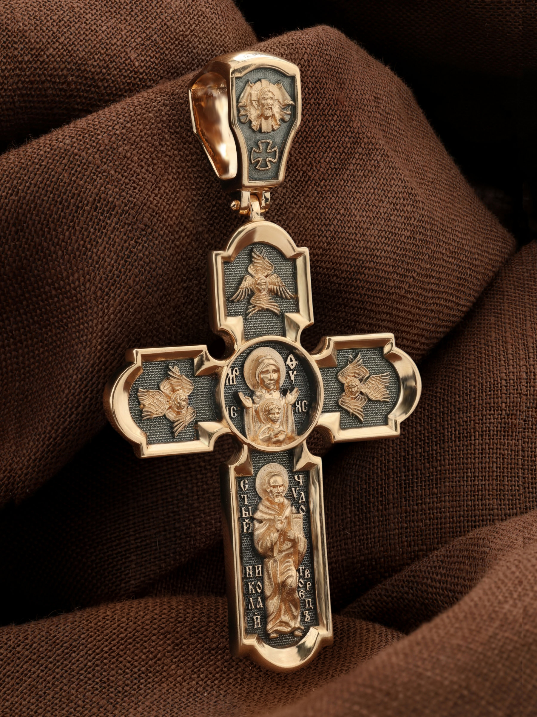 На лицевой стороне нательного креста по традиции изображено Распятие Господа нашего Иисуса Христа. Крест Господень стоит на небольшом каменистом возвышении, символизирующем гору Голгофу, которая обозначена буквами МЛРБ (Место Лобное Рай Бысть). Над головой Господа на поперечной перекладине написано «ИНЦИ», что символизирует табличку, которая была прибита к Кресту, с надписью «Иисус Назорей Царь Иудейский». Этим иудеи хотели посмеяться над Христом, не зная, что распинают истинного Царя всех царей. По сторонам основной перекладины расположены позолоченные рельефные инициалы Христа «ИС ХС». Под перекладиной, по сторонам древа, находится надпись «СЫН БОЖИЙ», а в основании креста — надпись «НИКА» (Победитель).
