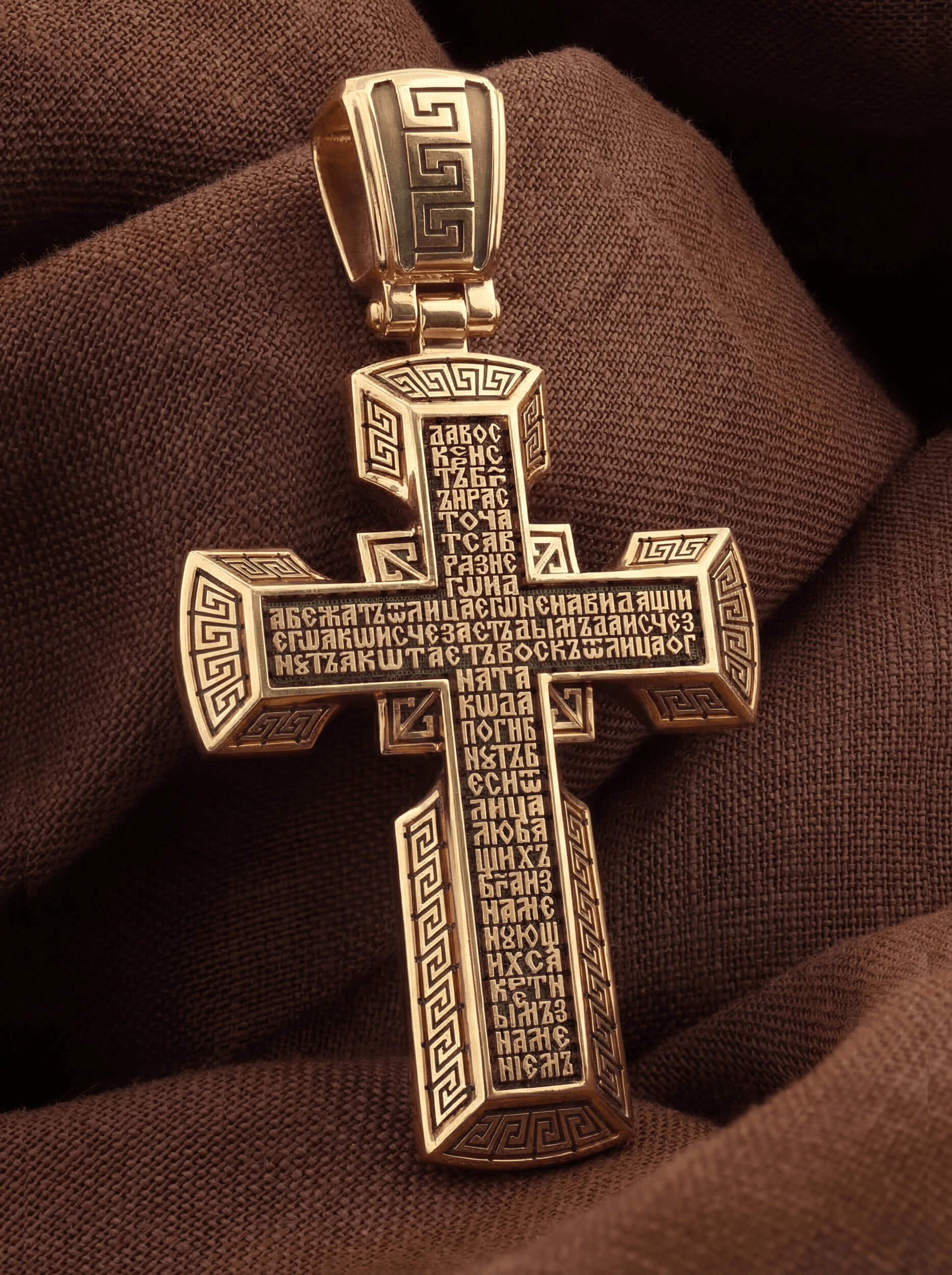 Рамка, украшенная византийским орнаментальным мотивом, обрамляет простой и очень традиционный нательный крест.