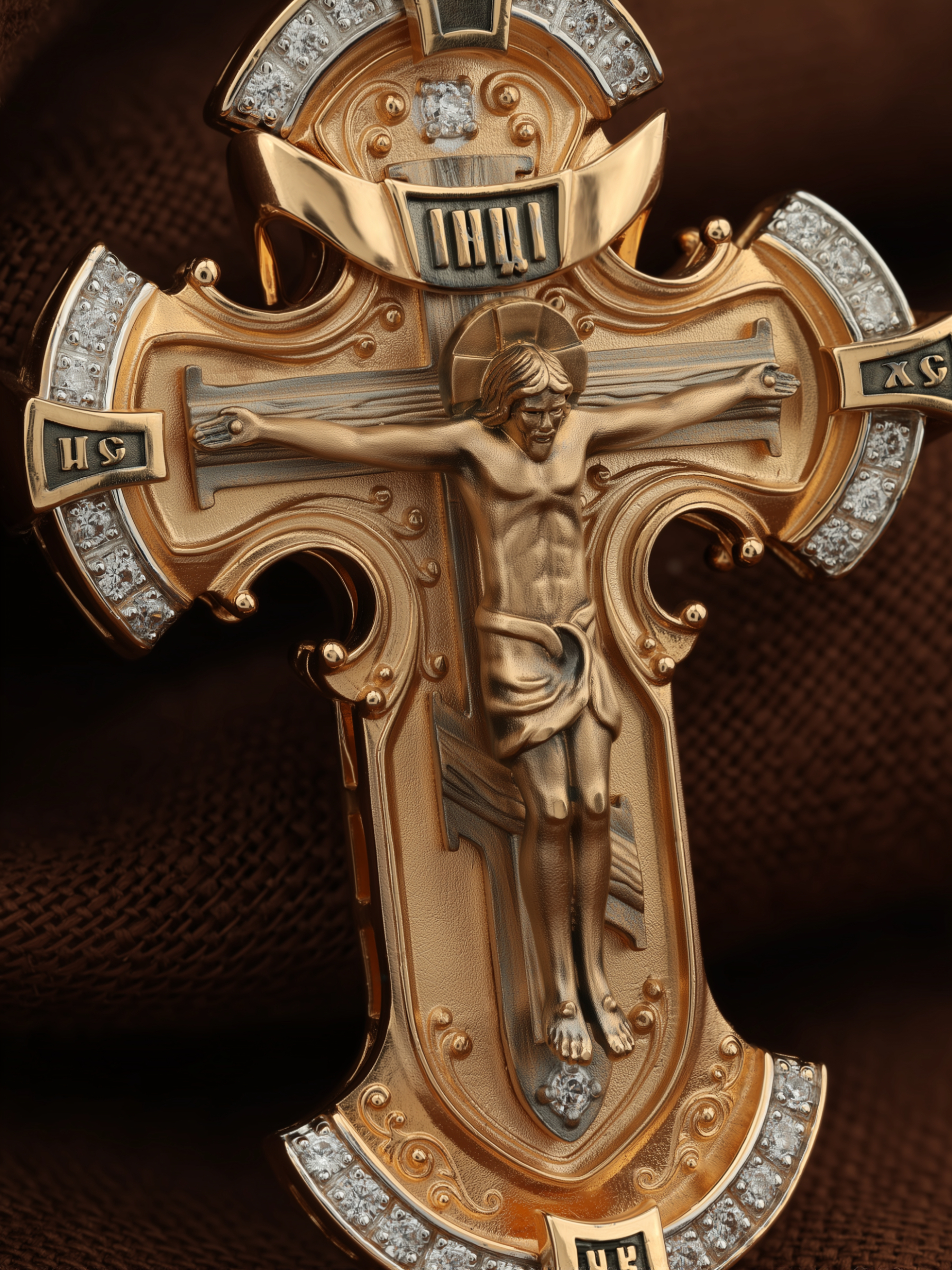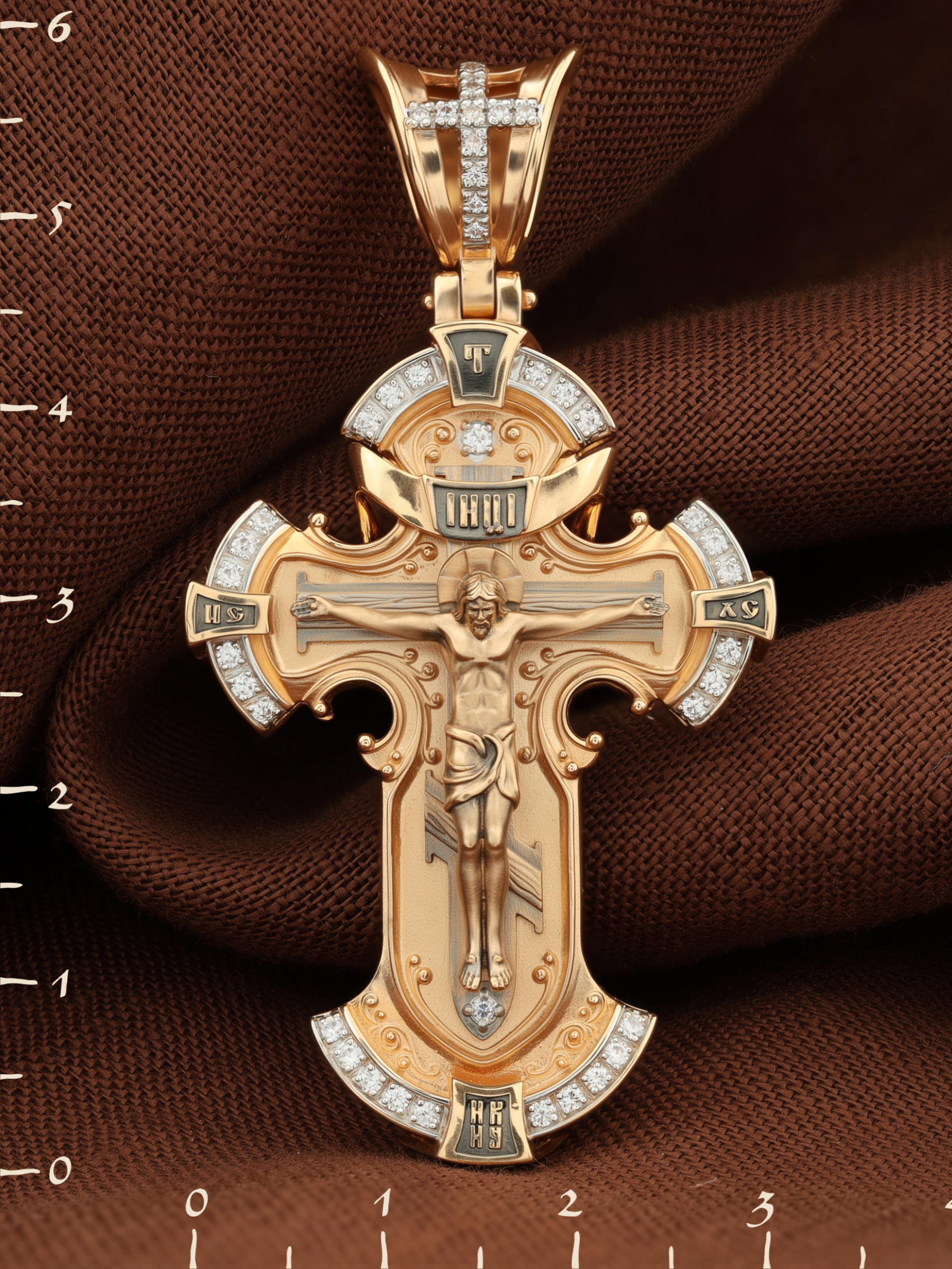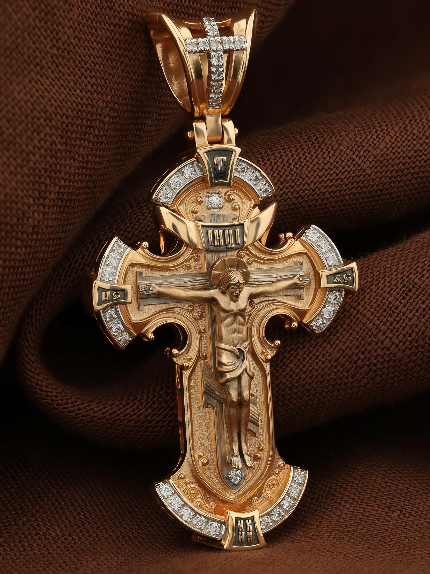 На лицевой стороне креста изображено Распятие Иисуса Христа на Голгофском Кресте, верхняя перекладина которого символизирует титло — табличку, на которой, согласно Евангелию, было начертано: Иисус Назорей Царь Иудейский (IНЦI). Справа и слева от Распятия изображены символы «IС ХС» — святое имя Христа. Внизу креста написано слово «НИКА», что значит «победитель». В верхней части креста обозначена буква «Т», которая символизирует одно из орудий страданий Господа — трость.
