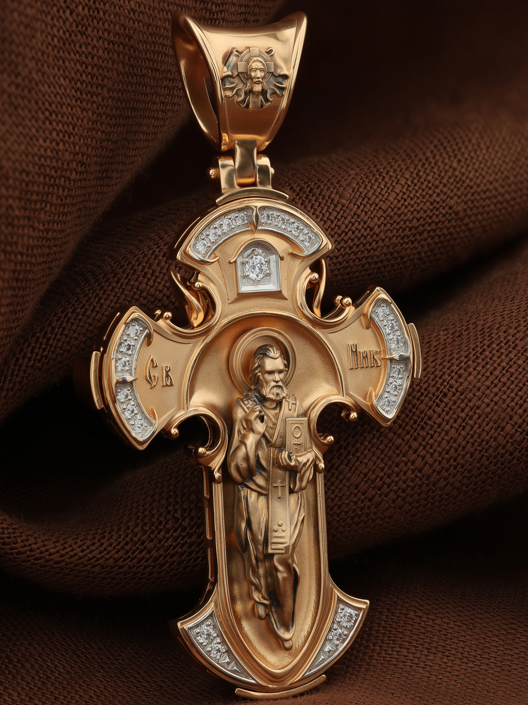 Оборотную сторону креста возглавляет икона святителя Николая Чудотворца. На кулонном кольце помещено изображение Спаса Нерукотворного — образ Спасителя, который Он запечатлел на плате и передал для исцеления больному проказой царю Эдессы. ему придается победное и защитное значение.