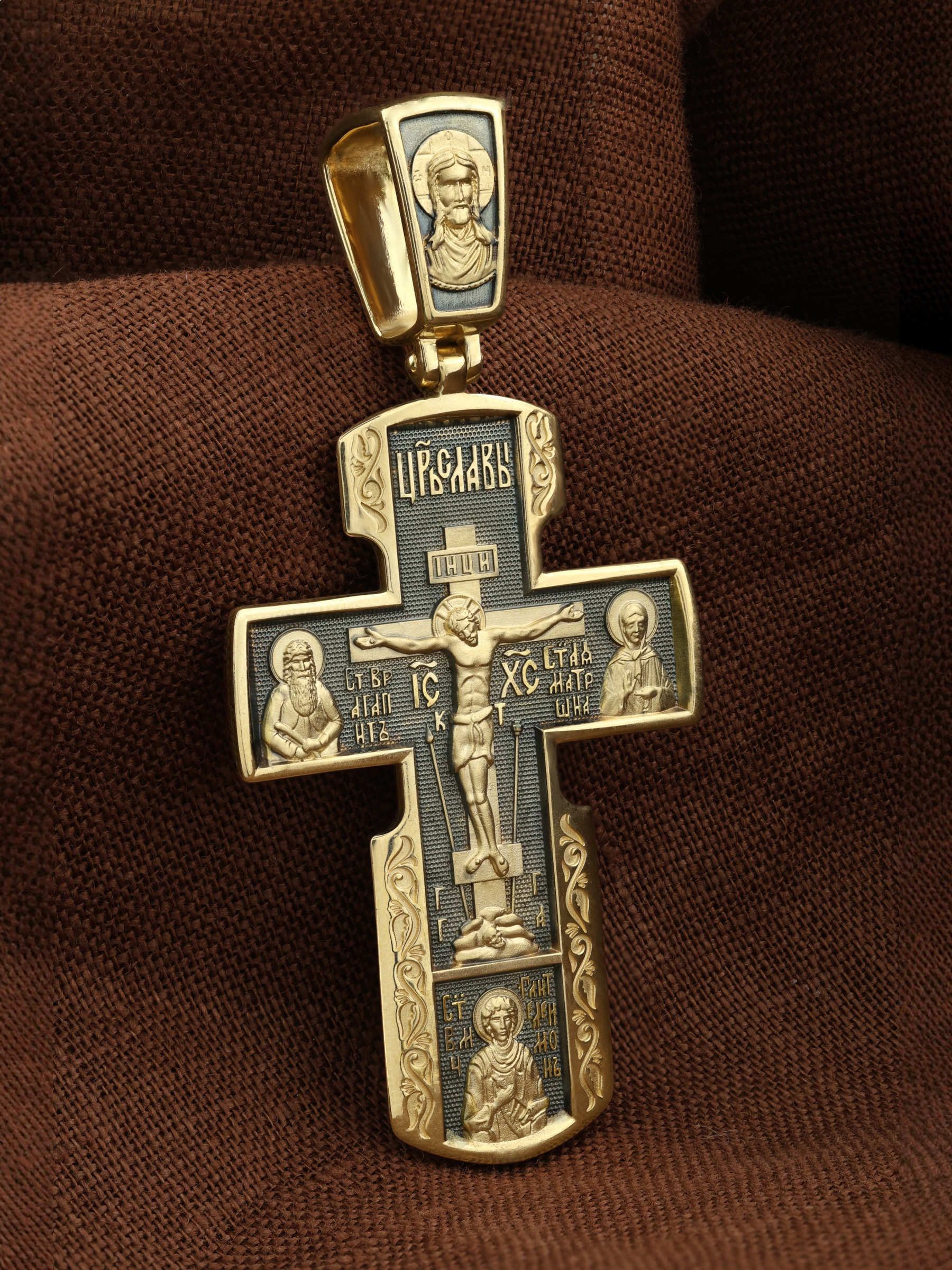 На лицевой стороне креста изображено Распятие Иисуса Христа на Голгофском Кресте. Над титлом видим слова «ЦРЬ СЛВЫ» — Царь Славы. Верхняя перекладина символизирует собой табличку с надписью «IHЦI» — Иисус Назарянин Царь Иудейский. Над перекладиной пишется сокращенно имя Спасителя «IC XC» — Иисус Христос, ниже перекладины добавляется: «НИКА» (греч. — Победитель). Возвышение, на котором стоит Крест, символизирует гору Голгофу, на которой произошло Распятие. У подножия Креста изображают прах Адама, обозначенный черепом.. Справа от Распятия помещен образ прославленной святой блаженной Матроны. «Матронушка», — ласково называют эту святую православные за удивительную любовь и помощь, которую она подает всем нуждающимся в ее поддержке. Слева — икона прп. Агапита. Этот святой жил в пещерах Киево-Печерского монастыря в XI веке и бескорыстно врачевал мирян и монахов.