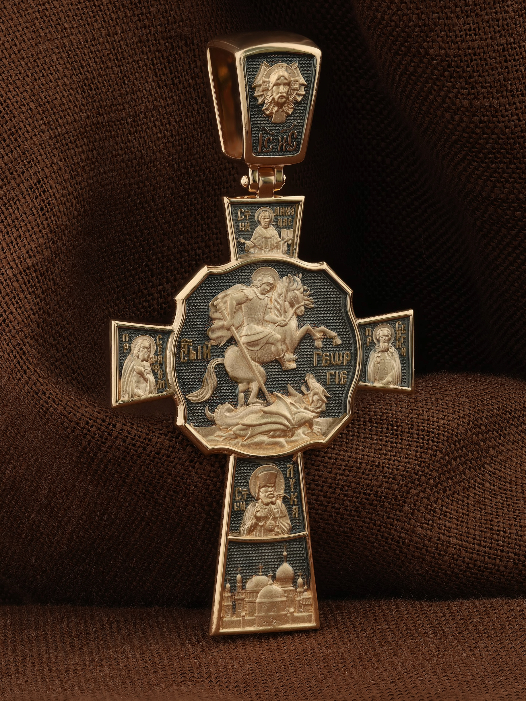 В центре оборотной стороне креста помещен образ Святого Великомученика Георгия Победоносца — одного из самых почитаемых и удивительных святых. На образке он изображен как воитель поражающий копьем огнедышащего змея. Змей символизирует собою сатанинские силы. Справа помещен образ Святого Преподобного Сергия, игумена Радонежского, чудотворца, слева — Преподобного Серафима Саровского, чудотвореца. Выше помещен образ Святителя Николая архиепископа Мир Ликийских, чудотвореца, ниже — образ святителя Луки (Войно-Ясенецкого), архиепископа Симферопольского и Крымского, исповедника и изображение Храма. На кулонном кольце изображен Спас Нерукотворный — образ Господа и Спасителя нашего Иисуса Христа, чудесно отпечатавшийся на плате, котором Христос вытер свой лик.