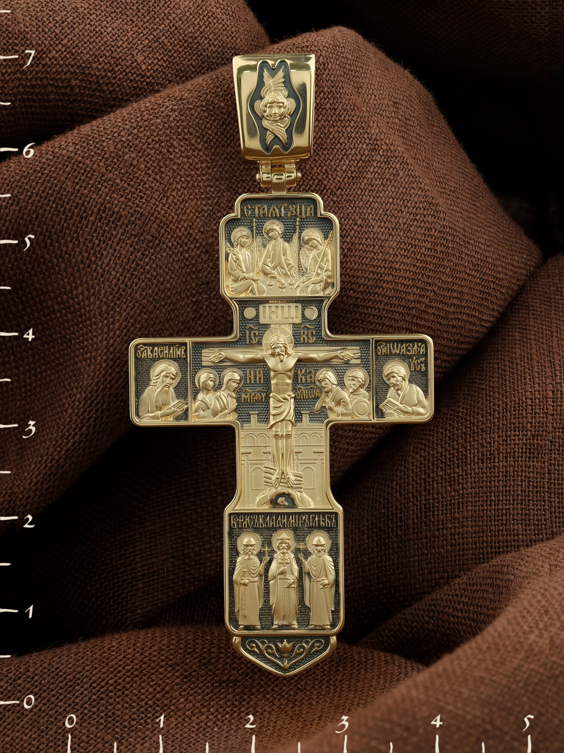 На концах горизонтальной балки креста помещены образы вселенских святителей и творцов литургии Василия Великого и Иоанна Златоуста. В кулонном кольце изображены райские врата с их стражем — Херувимом. Врата, которые открылись благодаря крестной жертве Христа.