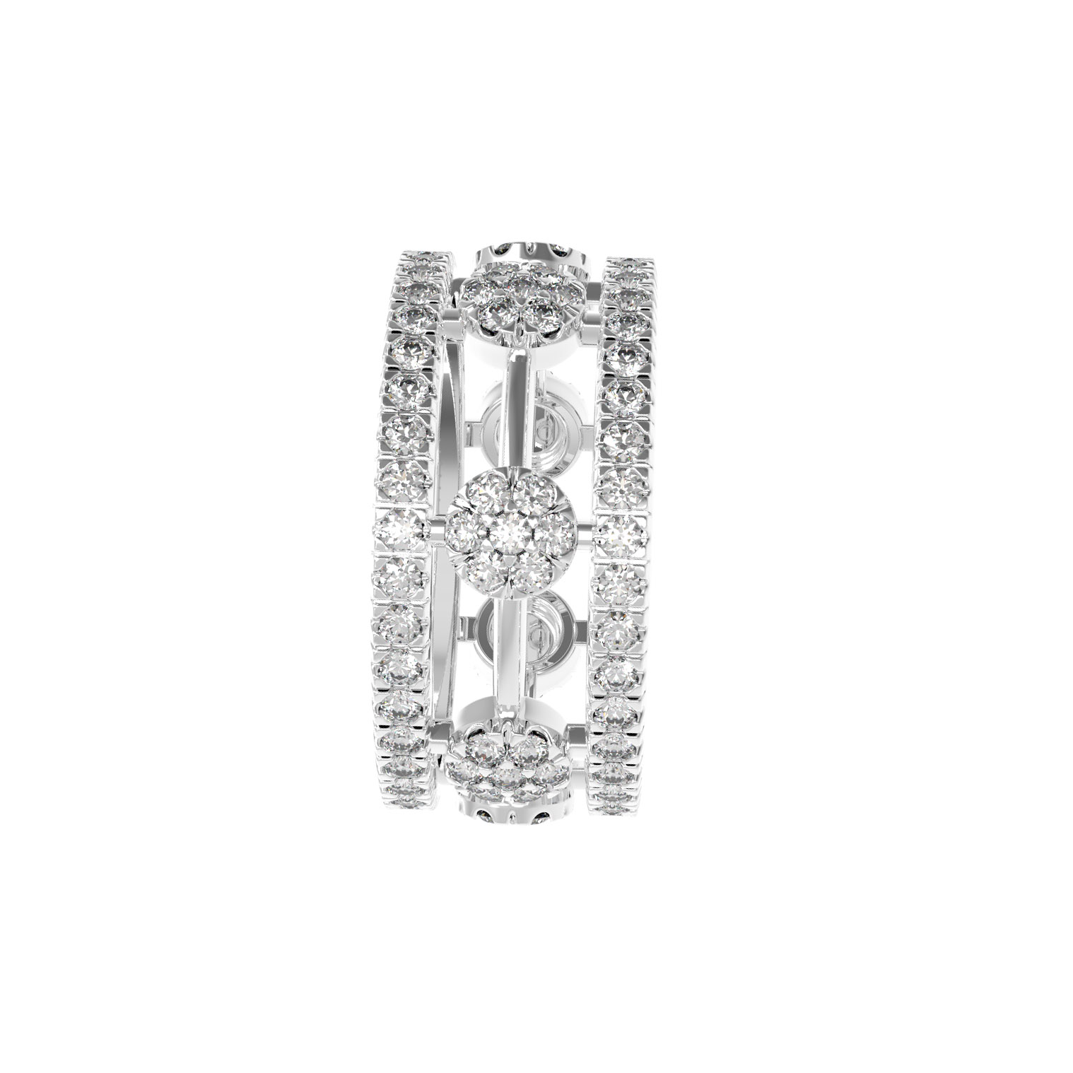 Особую ценность модели придает внушительная россыпь вставок: 127 бриллиантов с огранкой круг чаруют своей игрой света и безупречным белым цветом. Благородный холодный оттенок белого золота идеально сочетается с чистотой драгоценных камней, создавая гармоничный и завершенный образ. Сложная и детализированная конструкция кольца привлекает внимание к мастерству исполнения, где каждая деталь продумана до мелочей.