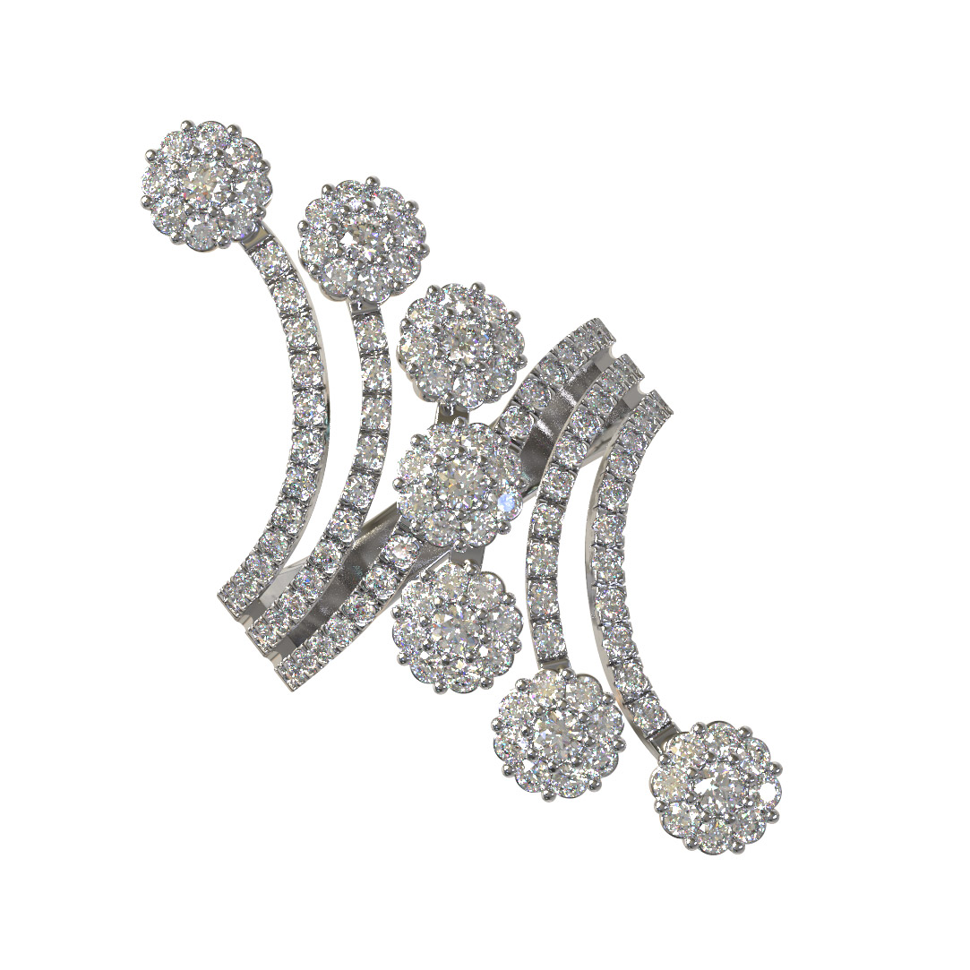В оформлении использованы 129 бриллиантов, которые отличаются чистотой и ярким блеском. Белые вставки круглой формы гармонично сочетаются с холодным благородным сиянием металла, подчеркивая статусность украшения. Это кольцо создано для ценителей эксклюзивного дизайна и станет великолепным дополнением коллекции как для женщин, так и для мужчин.