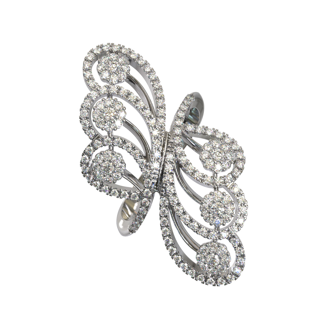 Основой кольца служит благородное белое золото 585 пробы, холодный блеск которого идеально сочетается с сиянием драгоценных камней. Роскошное украшение инкрустировано 166 бриллиантами круглой формы, которые дарят аксессуару неповторимый блеск при любом освещении. Белые вставки распределены по всей поверхности изделия, подчеркивая каждый изгиб металла и создавая гармоничную композицию.