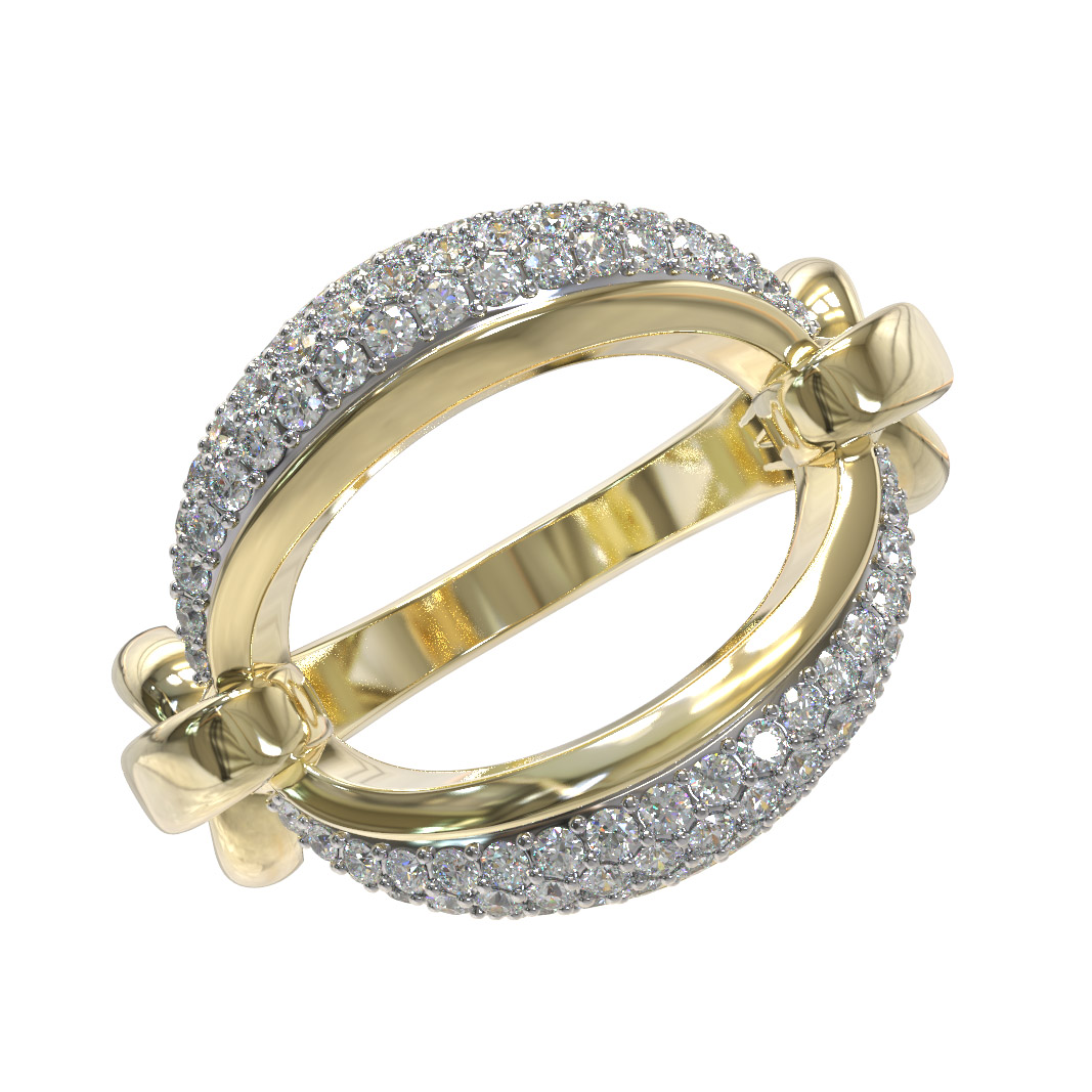 Роскошное кольцо из лимонного золота 585 пробы станет центральным акцентом любого образа. Дизайн украшения, вдохновленный эстетикой коллекции De Luxe Бриллианты — Royal, отличается сложной и динамичной геометрией. Изысканная шинка, выполненная из благородного металла лимонного оттенка, дополнена активным декоративным элементом, который создает выразительный объем и придает изделию современный вид. Особую ценность кольцу придает инкрустация: 86 бриллиантов круглой формы с классическим белым цветом вставок создают ослепительное сияние при каждом движении руки.