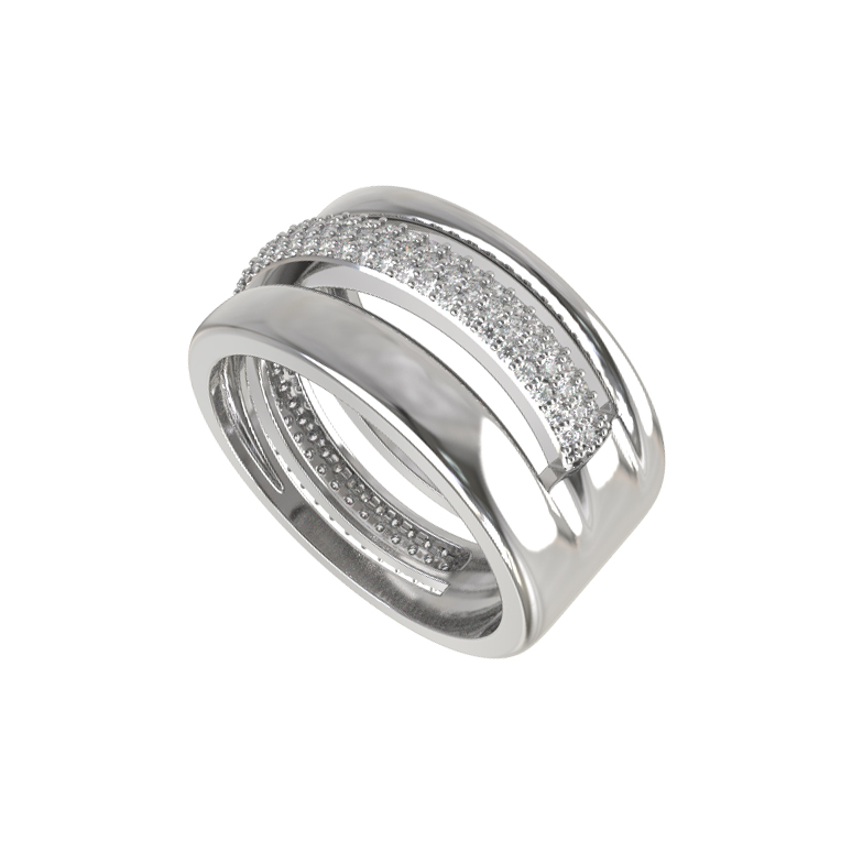 Центральную часть изделия украшает россыпь из 127 бриллиантов круглой огранки. Белые камни обладают ослепительным сиянием, которое эффектно контрастирует с холодным блеском белого золота. Сложная многослойная конструкция кольца создает объем и динамику, превращая украшение в настоящее произведение искусства. Тщательная полировка металла до зеркального блеска придает кольцу благородный вид, делая его идеальным дополнением к вечернему наряду или акцентным элементом делового стиля.