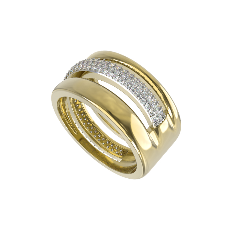Особую роскошь изделию придает композиция из 127 бриллиантов круглой формы. Белый цвет вставок создает яркий контраст на фоне теплого лимонного оттенка металла, заставляя украшение буквально гореть на свету. Благодаря широкой форме и массивности, это кольцо одинаково органично смотрится как на женской, так и на мужской руке, подчеркивая уверенность и чувство вкуса владельца.