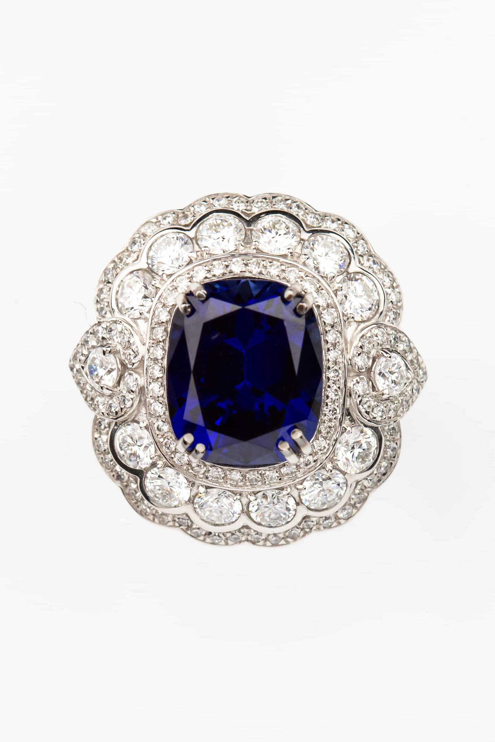 Роскошное кольцо из белого золота 585 пробы станет центральным акцентом вашего образа. Изделие из коллекции De Luxe Бриллианты — Classic завораживает своим дизайном: в центре композиции расположен крупный сапфир синего цвета огранки кушон, который создает глубокий и насыщенный контраст с благородным металлом. Величественный образ дополняют 151 вставка из бриллиантов круглой формы белого цвета, искусно обрамляющие центральный камень и создающие великолепное сияние при каждом движении.