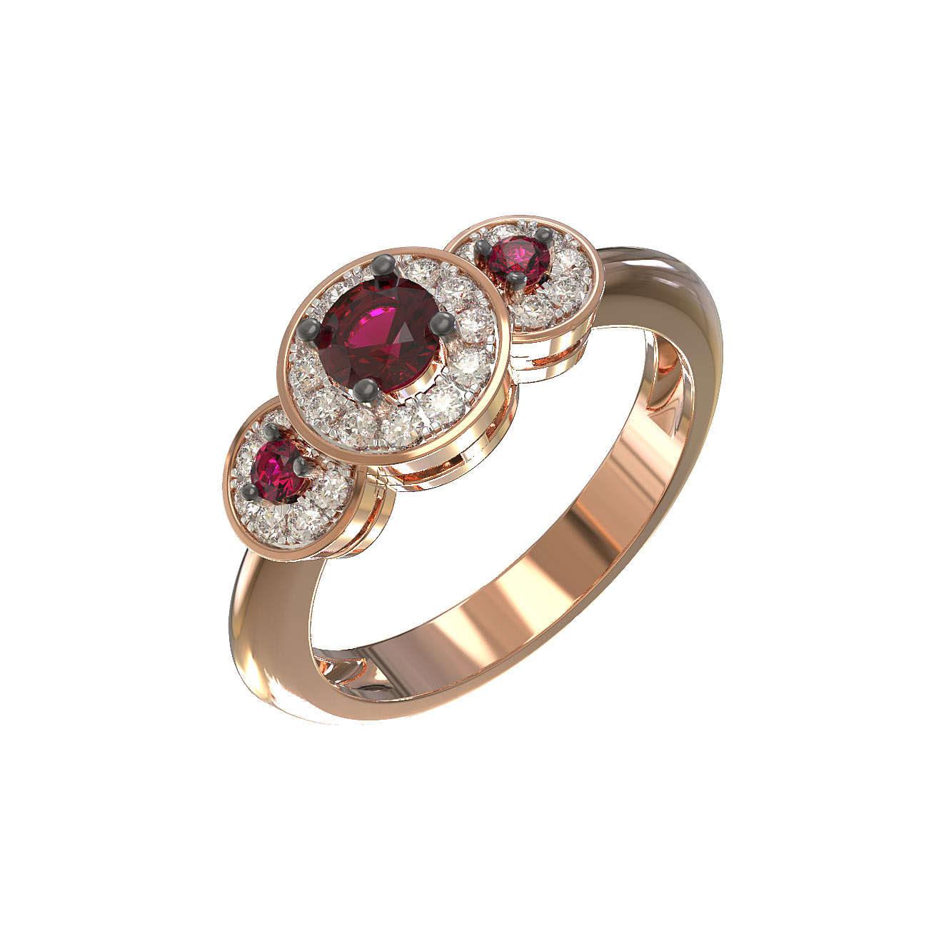 В центре композиции и боковых акцентах расположены рубины красного цвета, чей глубокий оттенок эффектно контрастирует с сиянием белых бриллиантов. Всего в украшении использовано 27 вставок круглой формы, что придает изделию особое очарование и блеск при каждом движении руки. Такое сочетание материалов и камней делает кольцо универсальным украшением, которое подходит как для женщин, так и для мужчин.