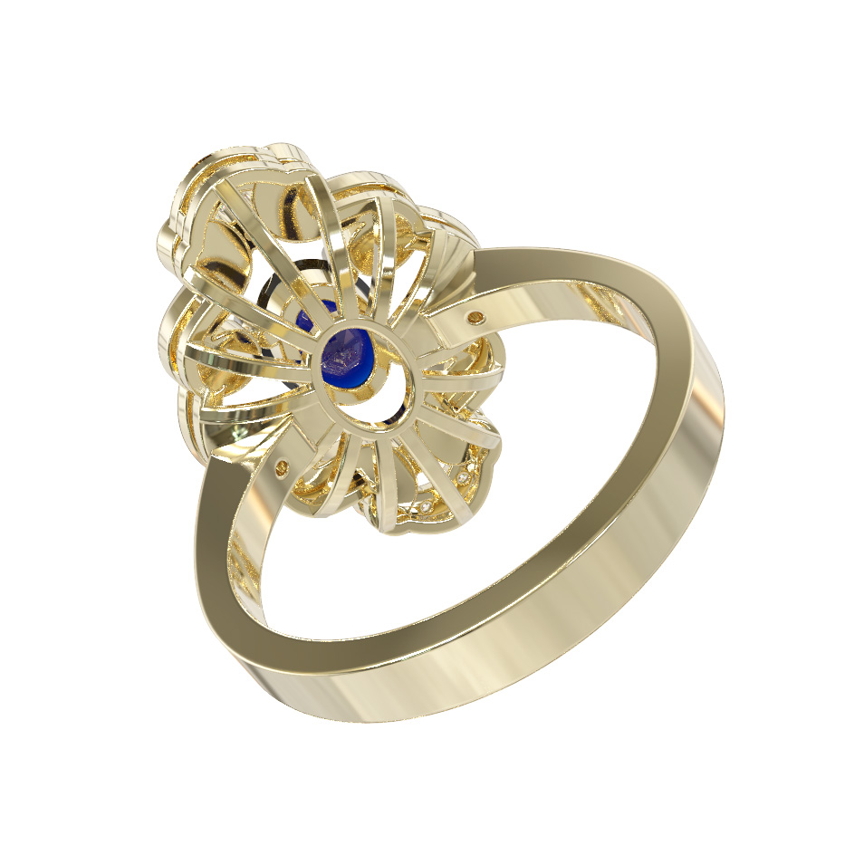 Кольцо из лимонного золота 585 пробы из коллекции De Luxe Бриллианты — Classic — это воплощение изысканности и утонченного вкуса. Мастерски выполненное изделие притягивает взгляд своей сложной, ажурной формой и благородным сочетанием драгоценных металлов и камней. В центре композиции расположен роскошный сапфир овальной формы глубокого синего цвета, который служит главным акцентом украшения. Его насыщенный оттенок эффектно контрастирует с теплым сиянием лимонного золота и ослепительным блеском 45 бриллиантов круглой огранки белого цвета.