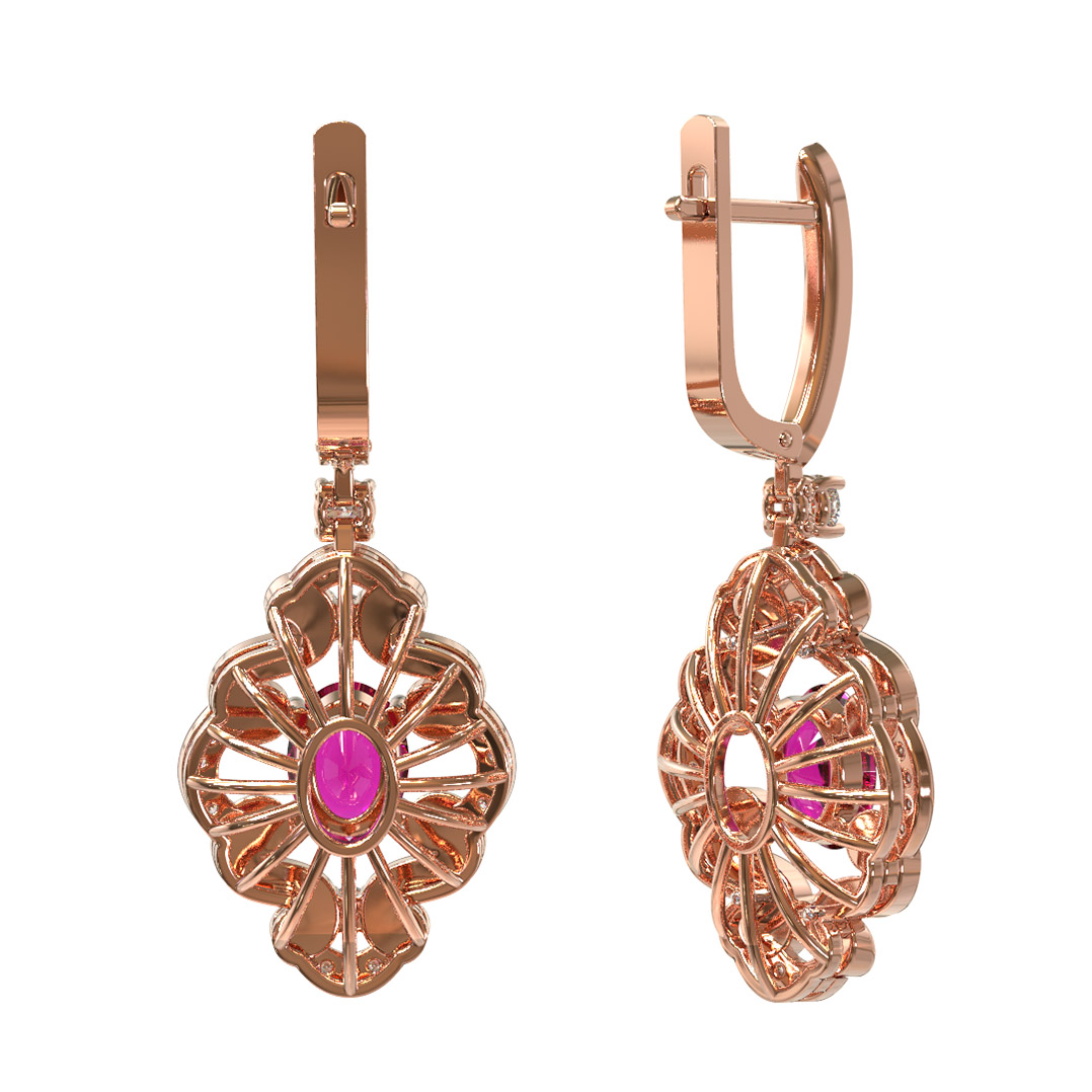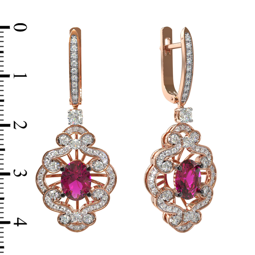 Роскошные серьги из красного золота 585 пробы — это воплощение утонченности и высокого ювелирного искусства. Изделие из коллекции De Luxe Бриллианты — Classic привлекает внимание своим изысканным дизайном и благородным блеском металла. Центральным элементом украшения выступают выразительные рубины насыщенного красного цвета, выполненные в классической овальной огранке. Они эффектно контрастируют с ослепительным сиянием белых бриллиантов, которые обрамляют основной камень и украшают декоративные элементы, создавая неповторимую игру света. Всего в композиции использовано 110 вставок круглой и овальной формы, что придает серьгам особую торжественность.