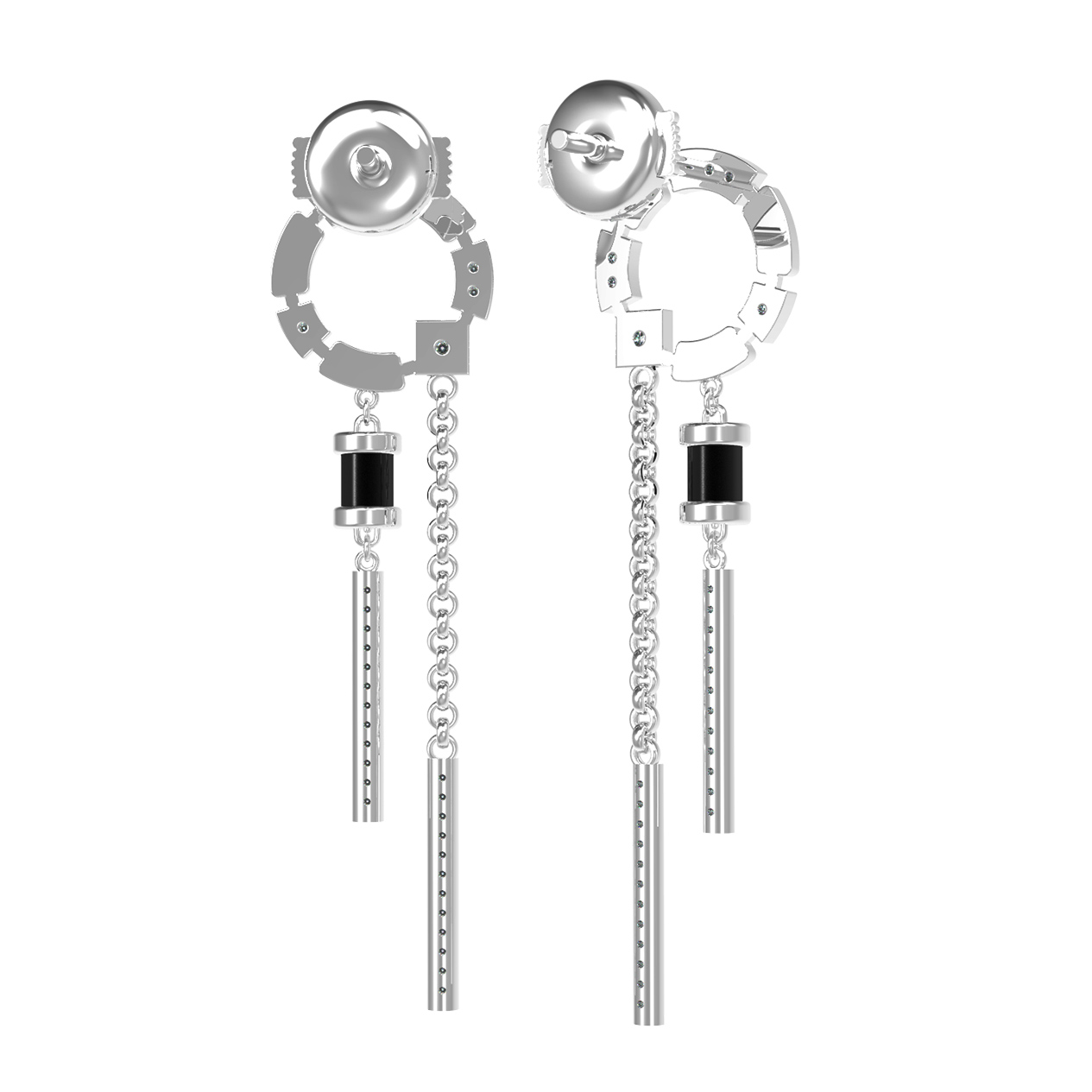 Главным акцентом дизайна стали вставки из оникса цилиндрической формы, которые привносят в изделие глубокий черный цвет, эффектно контрастирующий с белыми бриллиантами. Всего в серьгах использованы 64 вставки круглой и цилиндрической формы, искусно расположенные по всей конструкции. Бриллианты придают изделию роскошное мерцание, которое перекликается с лаконичной строгостью оникса.