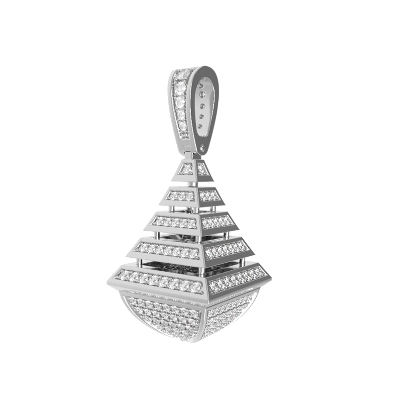 Роскошная подвеска из белого золота 585 пробы — это воплощение ювелирного мастерства и современного геометрического стиля. Изделие входит в коллекцию De Luxe Бриллианты — Pyramids, дизайн которой вдохновлен четкими линиями и архитектурной лаконичностью форм. Центральным элементом украшения стала сложная многоуровневая конструкция, напоминающая ступенчатую пирамиду, увенчанную элегантной петлей для крепления на цепь.