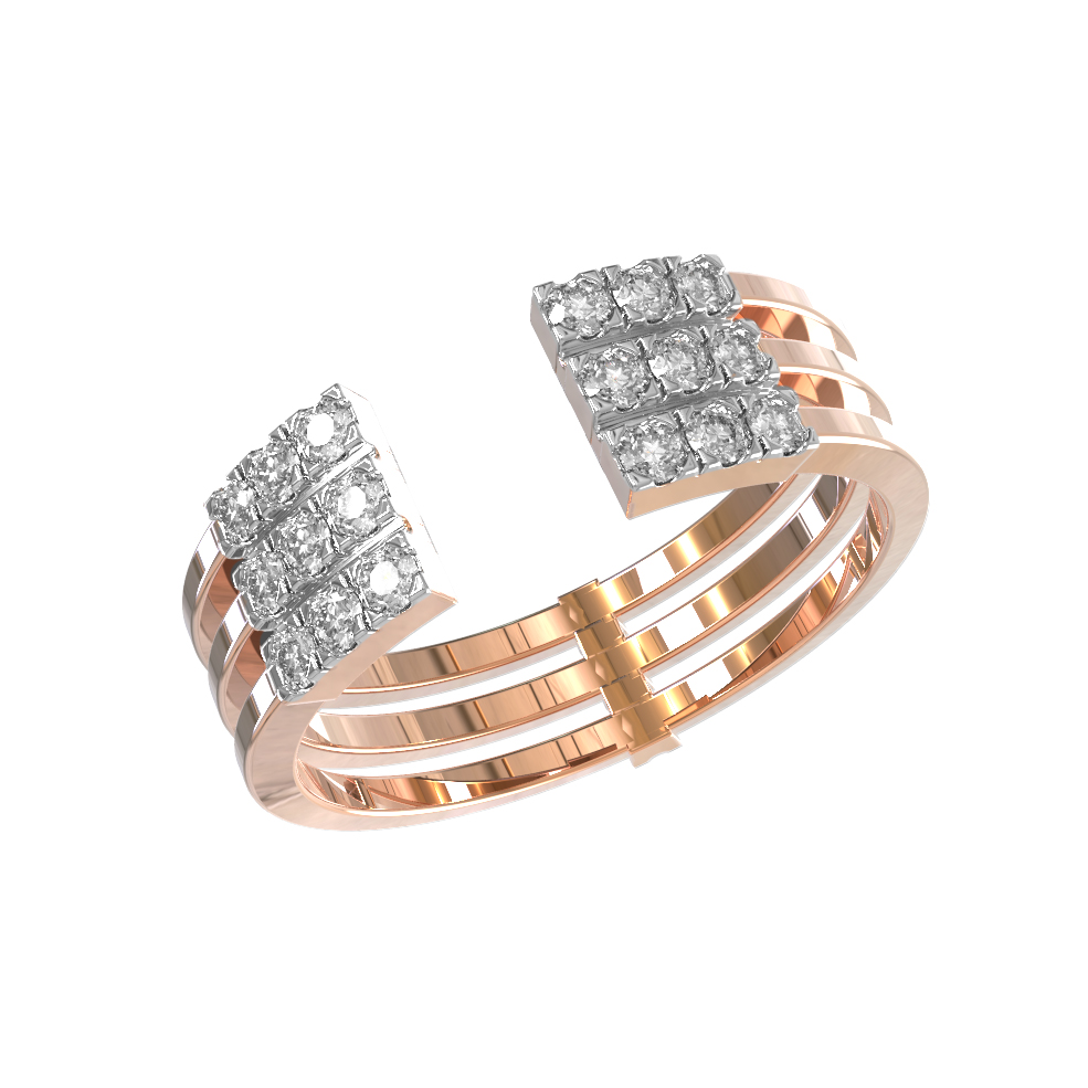 Кольцо из золота с бриллиантами из коллекции De Luxe Бриллианты — Diamond lines воплощает в себе современный взгляд на ювелирное искусство. Дизайн украшения, вдохновленный архитектурными линиями, построен на контрасте теплых и холодных оттенков драгоценных материалов. Основа выполнена из красного золота 585 пробы, что обеспечивает прочность и благородный блеск. Открытая конструкция состоит из трех параллельных шинок, которые плавно соединяются с двух сторон в эффектные площадки, украшенные инкрустацией.