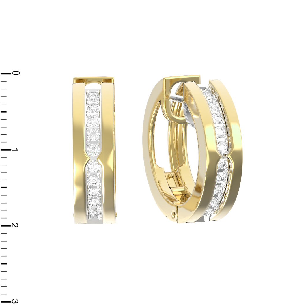 В центре композиции расположены 22 бриллианта круглой формы с чистым белым цветом вставок. Камни аккуратно инкрустированы в дорожку, проходящую по центру каждого изделия. Такой прием придает украшению динамику и яркость, позволяя свету играть на гранях при каждом вашем движении. Ювелирное изделие обладает универсальной геометрией, которая делает его подходящим аксессуаром как для женщин, так и для мужчин. Благодаря своему дизайну, эти серьги станут важным элементом образа, подчеркивая безупречный вкус владельца.