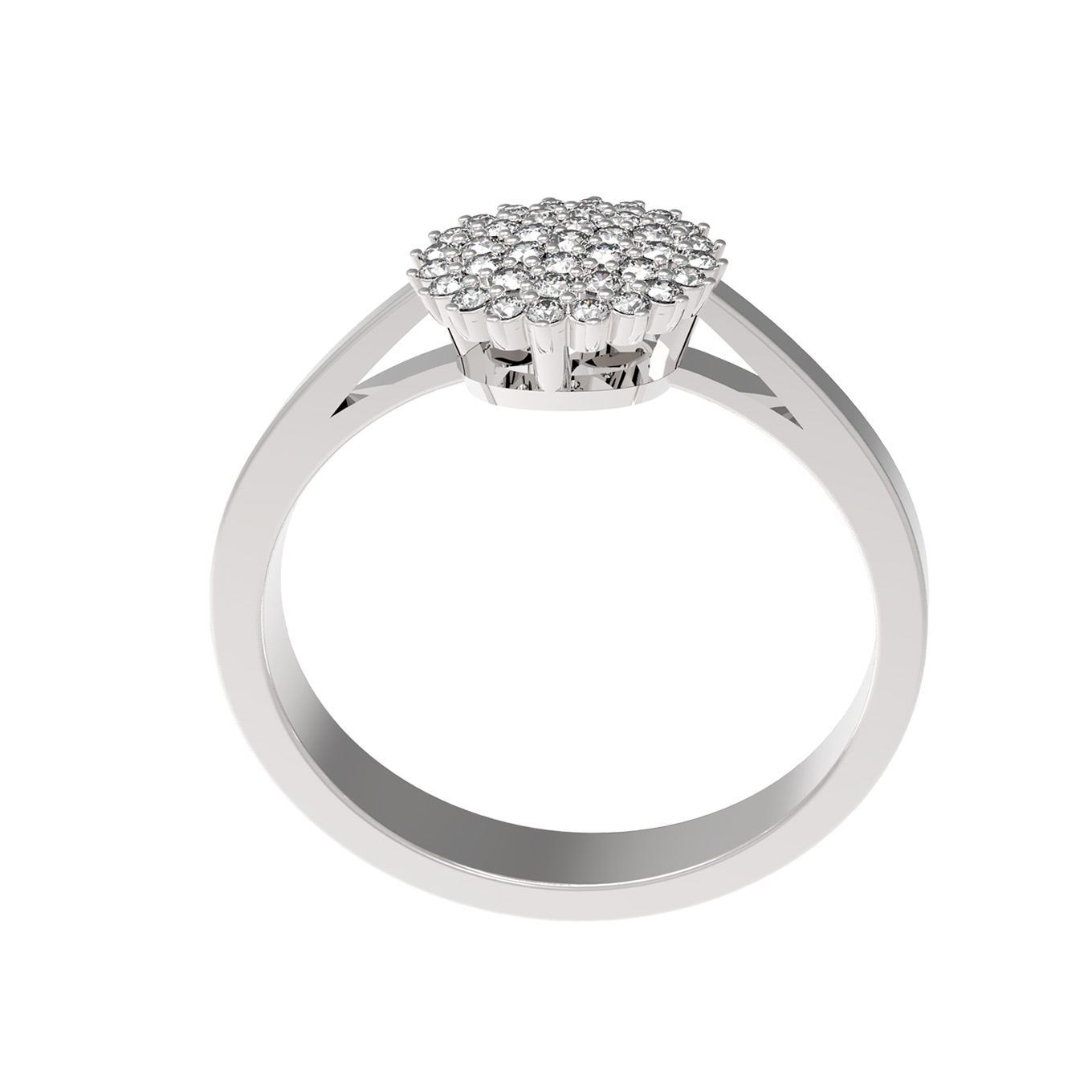 Центральная часть кольца декорирована композицией из 39 бриллиантов круглой огранки. Белые камни плотно прилегают друг к другу, создавая эффект сплошного мерцающего полотна, которое притягивает взгляды при каждом движении руки. Продуманный дизайн позволяет носить это кольцо как самостоятельный аксессуар, так и в качестве части ювелирного комплекта.