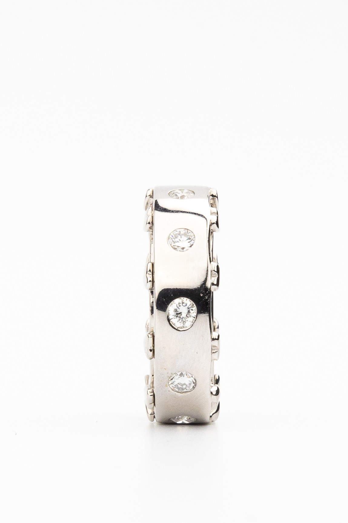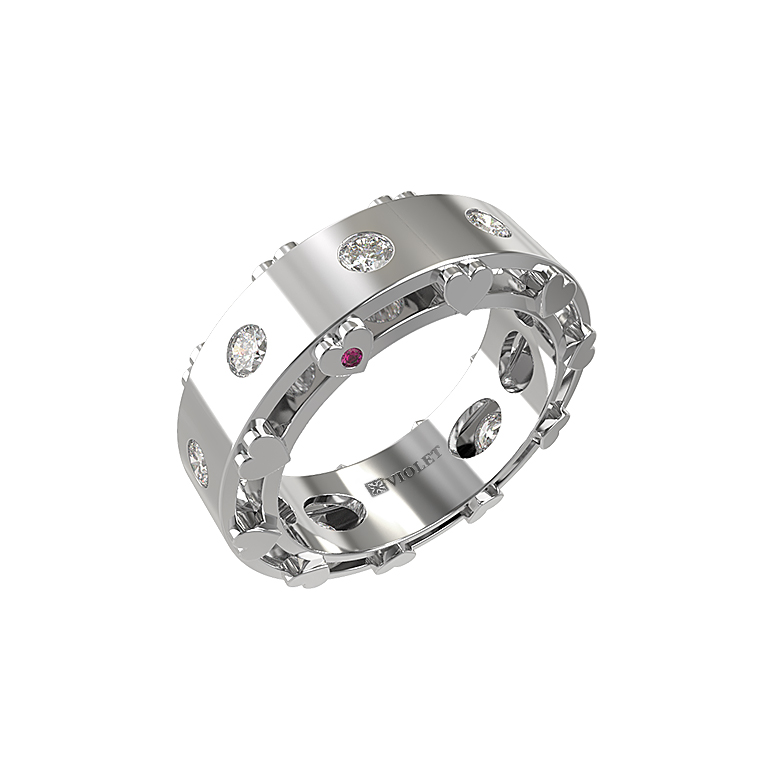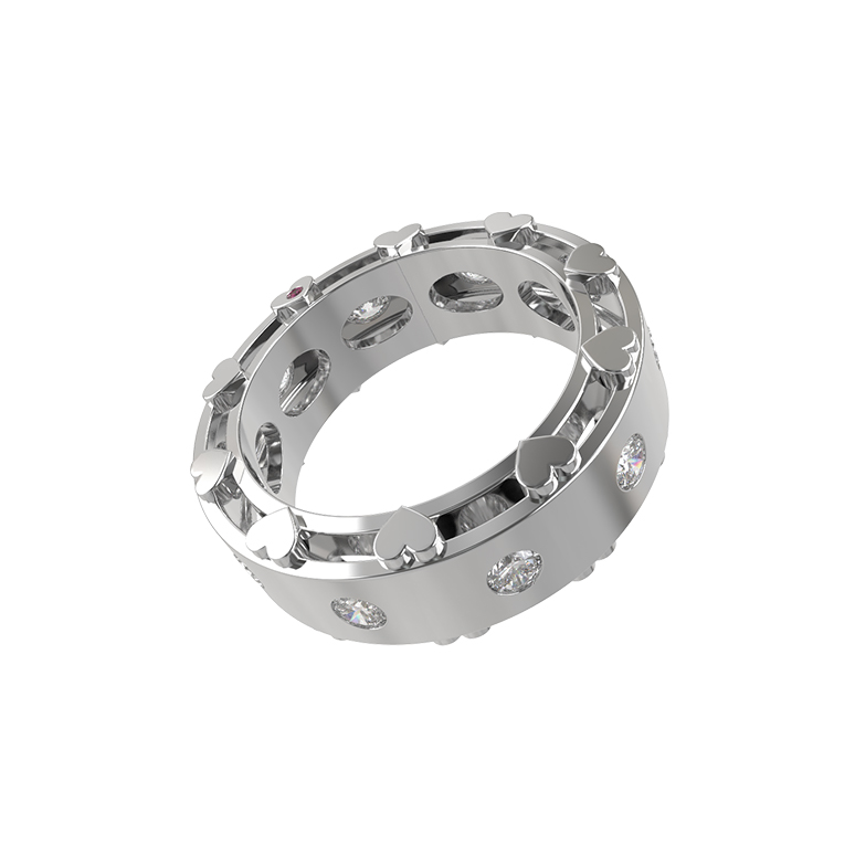 Центральным акцентом композиции выступают 12 вставок, среди которых роскошные бриллианты и яркий рубин. Круглая форма вставок классического белого и насыщенного красного цвета создает эффектную игру света, притягивающую восхищенные взгляды. Белое золото идеально обрамляет каждый камень, придавая украшению завершенный и безупречный вид.