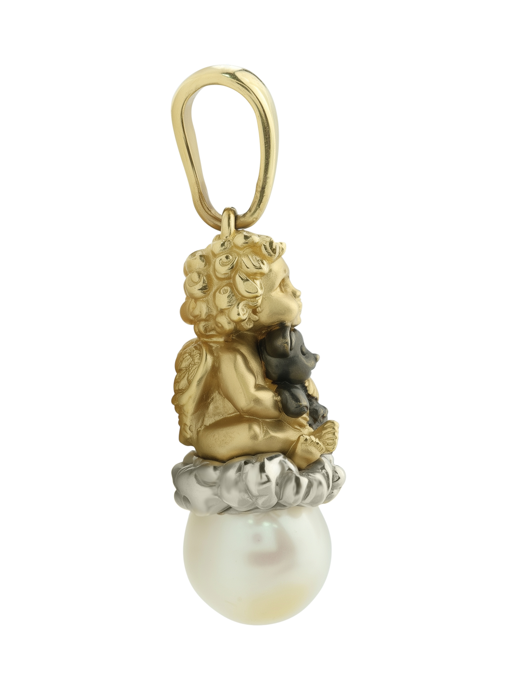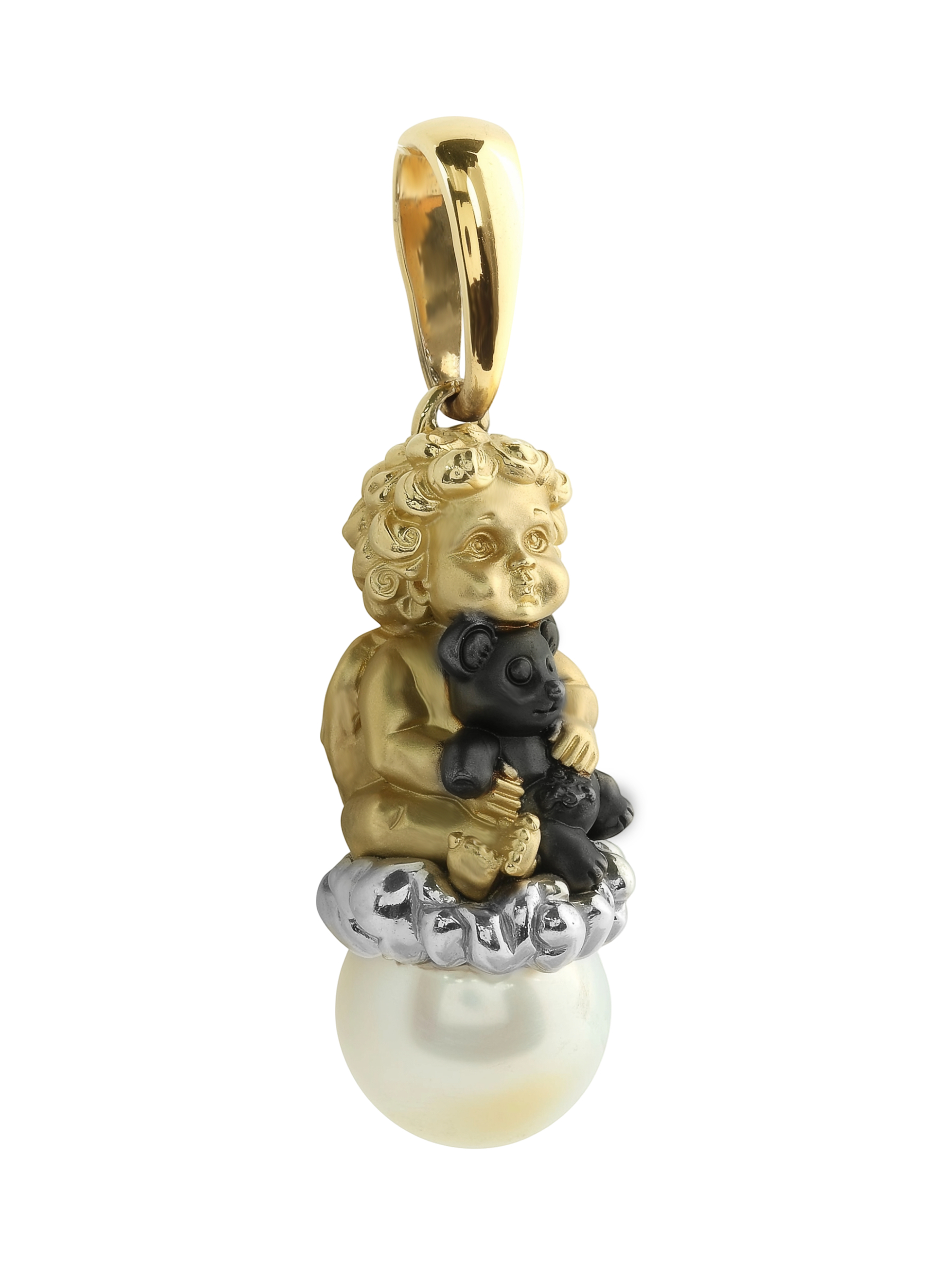 Подвеска из лимонного золота с жемчугом — это искусная работа, которая станет центральным акцентом вашего образа. Изделие из коллекции De Luxe — Купидоны выполнено в оригинальном дизайне: центральной фигурой является очаровательный Купидон, бережно обнимающий игрушку. Детализация подвески подчеркивает высокий уровень ювелирного мастерства, превращая украшение в настоящий объект искусства.
