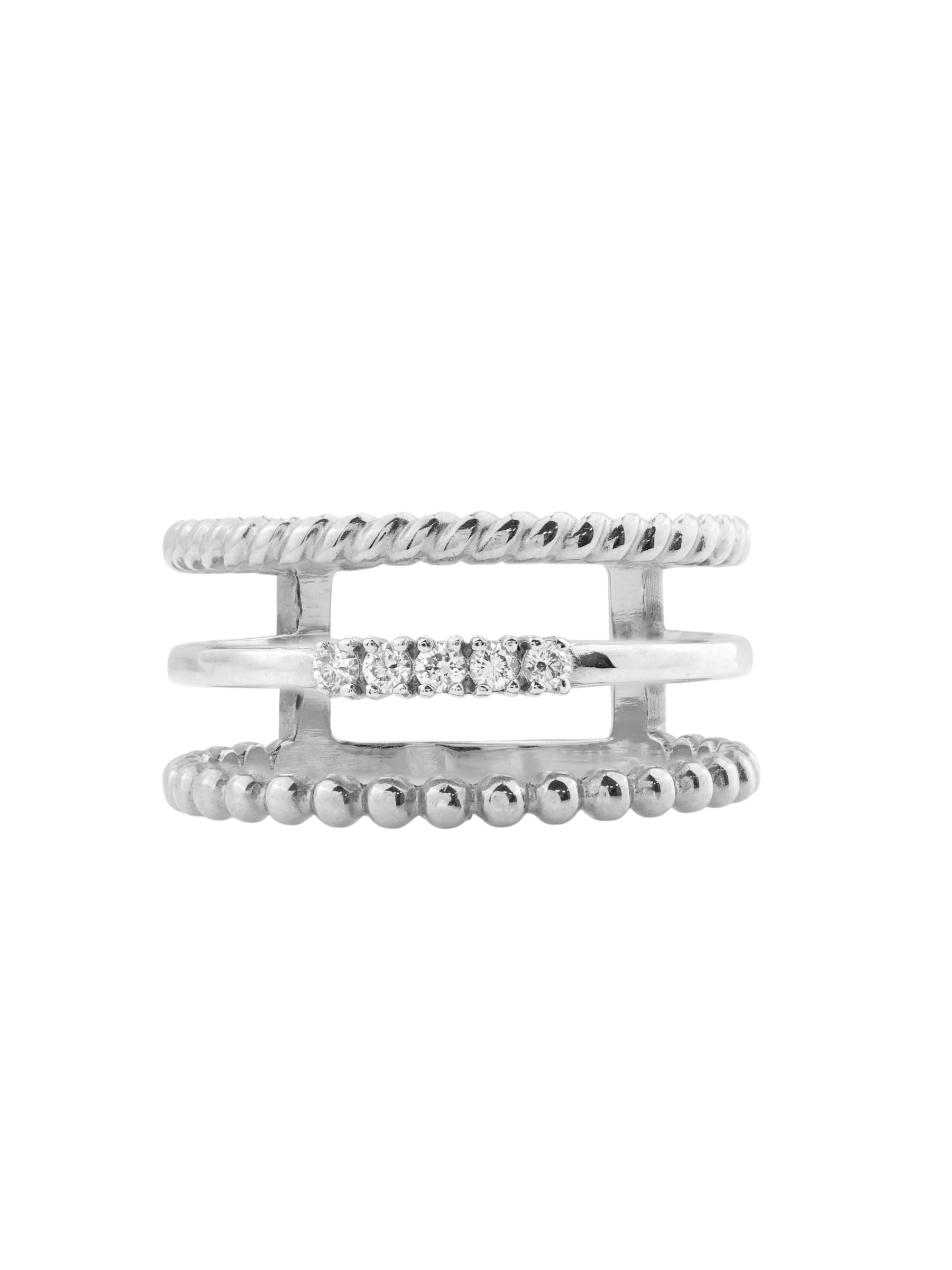Центральным элементом композиции является дорожка из 5 сверкающих бриллиантов. Белые вставки круглой огранки обладают завораживающим сиянием, которое эффектно подчеркивается холодным блеском белого золота. Сложная многослойная конструкция кольца делает его нетривиальным выбором для тех, кто ценит сочетание архитектурных форм и классических материалов. Это украшение универсально: оно гармонично смотрится как на женской, так и на мужской руке, становясь стильным аксессуаром для любого случая.