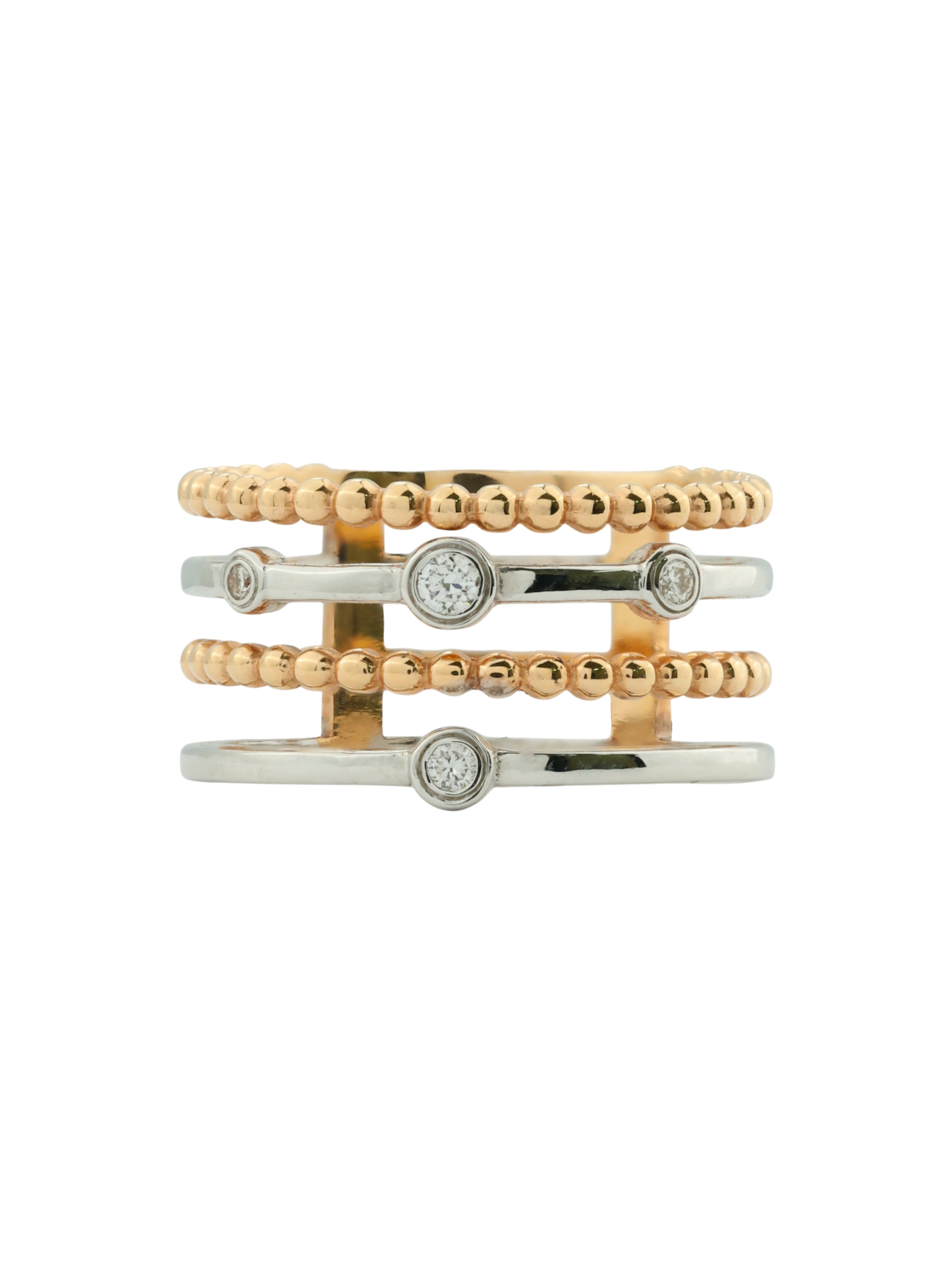 Элегантное кольцо из красного золота 585 пробы — это воплощение безупречного вкуса и современного стиля. Изделие из коллекции De Luxe Бриллианты — Balls привлекает внимание своей необычной многоярусной конструкцией: сочетание гладких линий и фактурных элементов, напоминающих изящные бусины, создает динамичный и выразительный объем. Ювелиры гармонично дополнили композицию четырьмя бриллиантами круглой формы, которые придают украшению особенное благородное сияние.