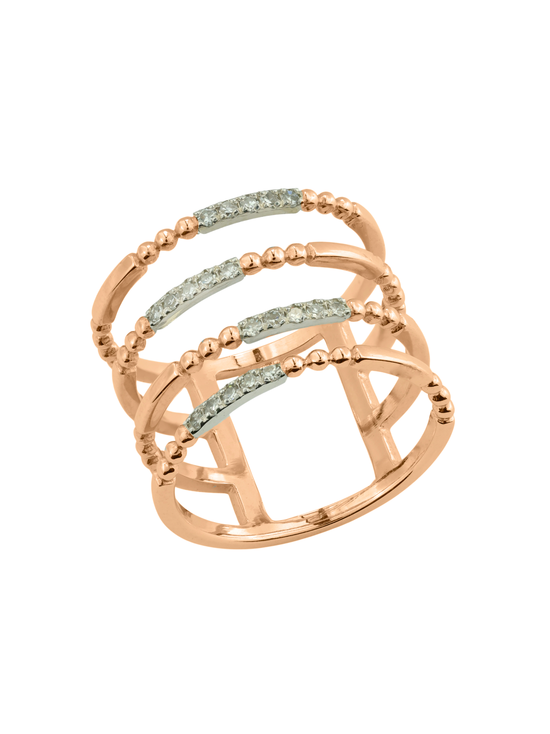Элегантное кольцо из красного золота 585 пробы станет безупречным акцентом вашего образа, подчеркивая утонченный вкус и статус. Украшение из коллекции De Luxe Бриллианты — Balls привлекает внимание своим необычным дизайном: широкая шинка выполнена из нескольких переплетающихся линий с оригинальной фактурой, напоминающей ряд изящных бусин. Контраст благородного красного золота и сияющих вставок делает это изделие универсальным дополнением как для повседневного, так и для вечернего гардероба.