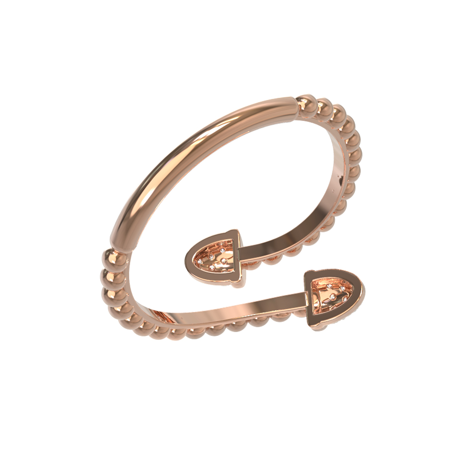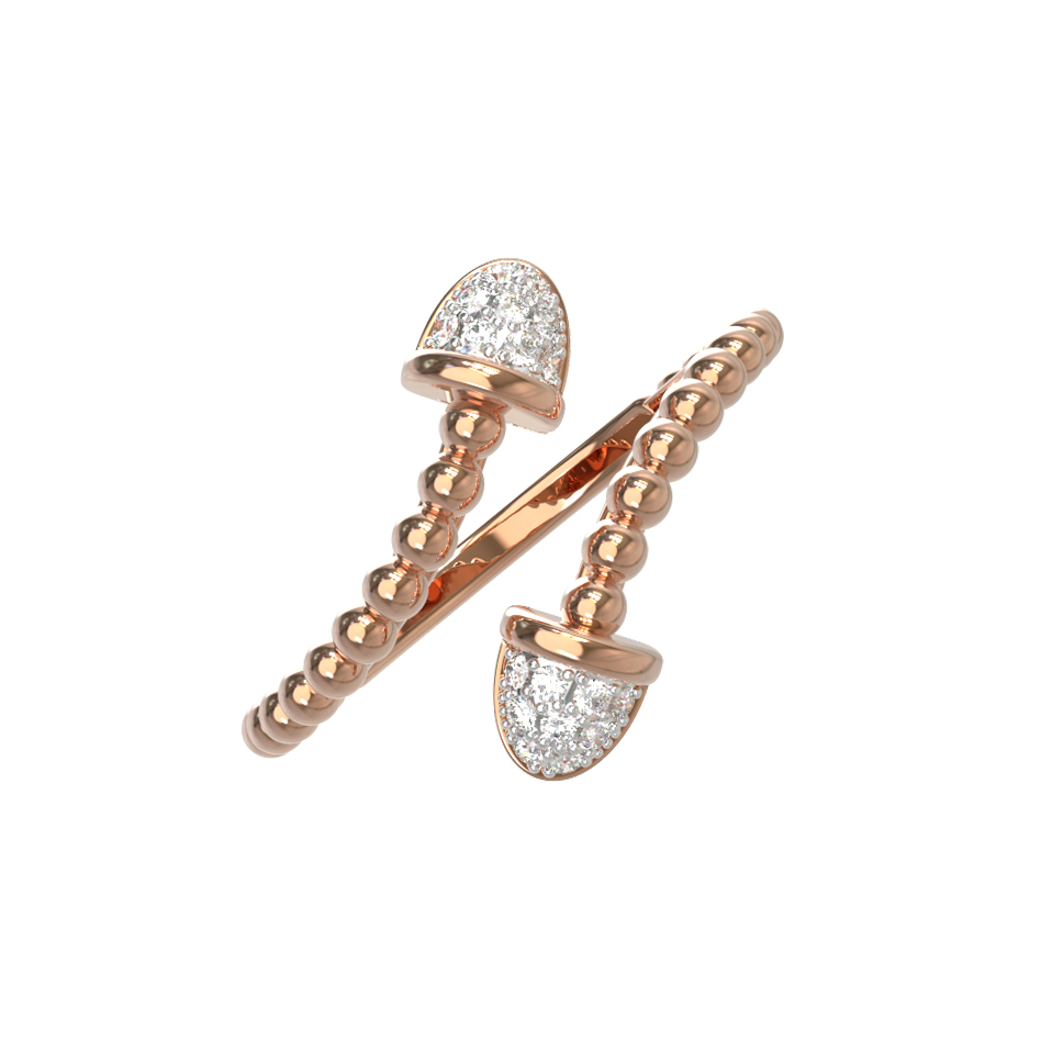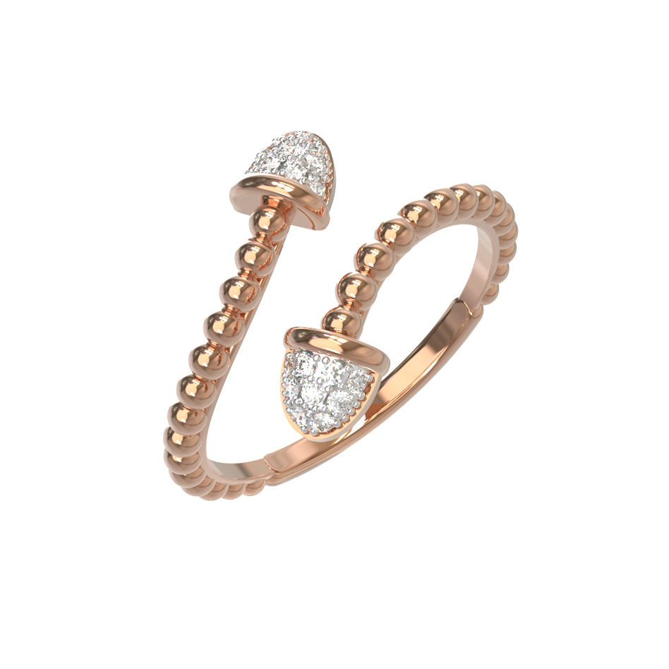 Изысканное кольцо из красного золота 585 пробы из коллекции De Luxe Бриллианты — Balls станет безупречным акцентом в вашем ювелирном гардеробе. Дизайн украшения воплощает современную эстетику и утонченную роскошь: основа кольца выполнена в оригинальной фактуре с декоративными шариками, создающими мягкую игру света на поверхности драгоценного металла. Разомкнутая форма изделия подчеркивает легкость и динамику образа, а завершают композицию два акцентных элемента, инкрустированные сверкающими бриллиантами.