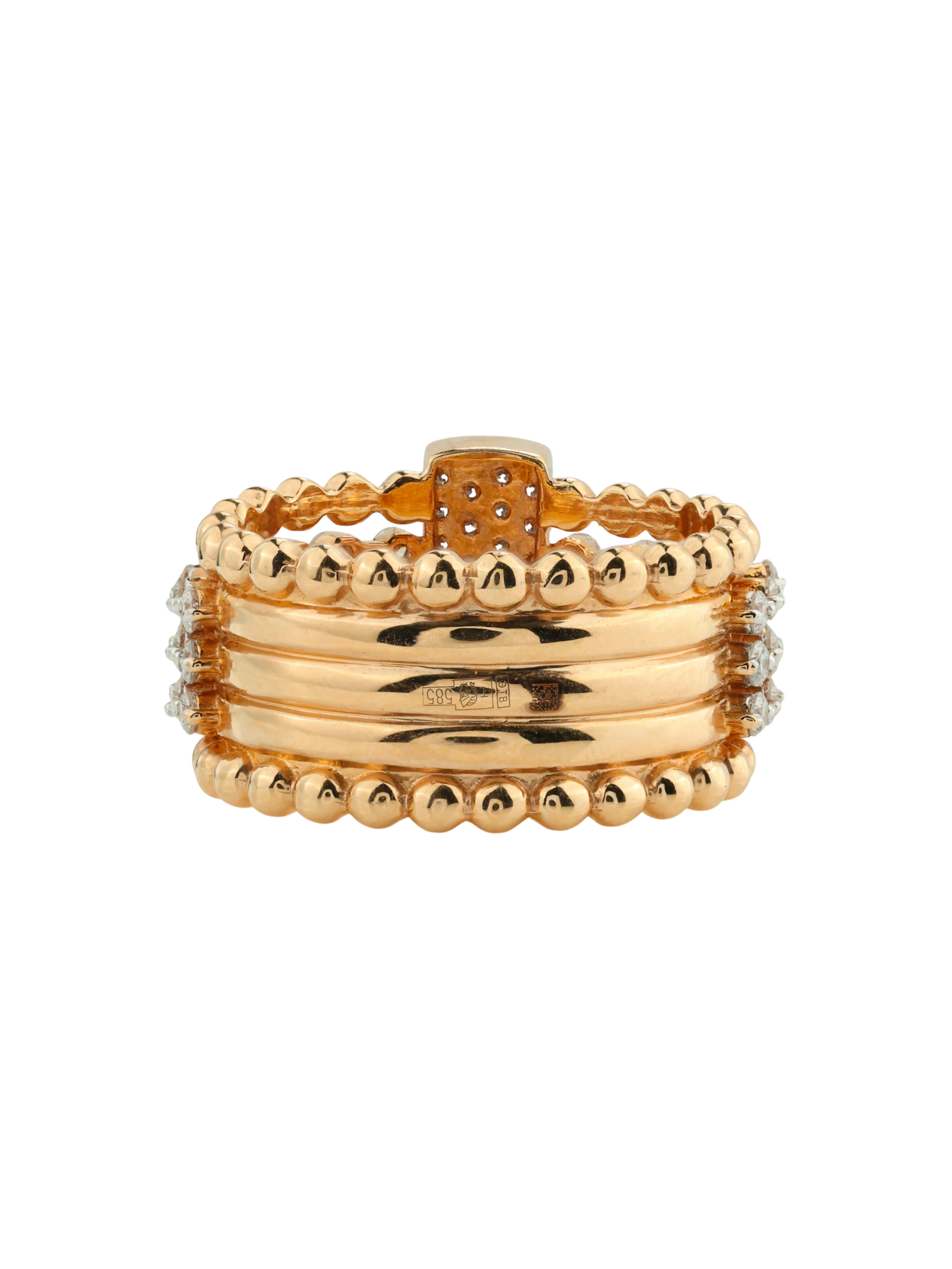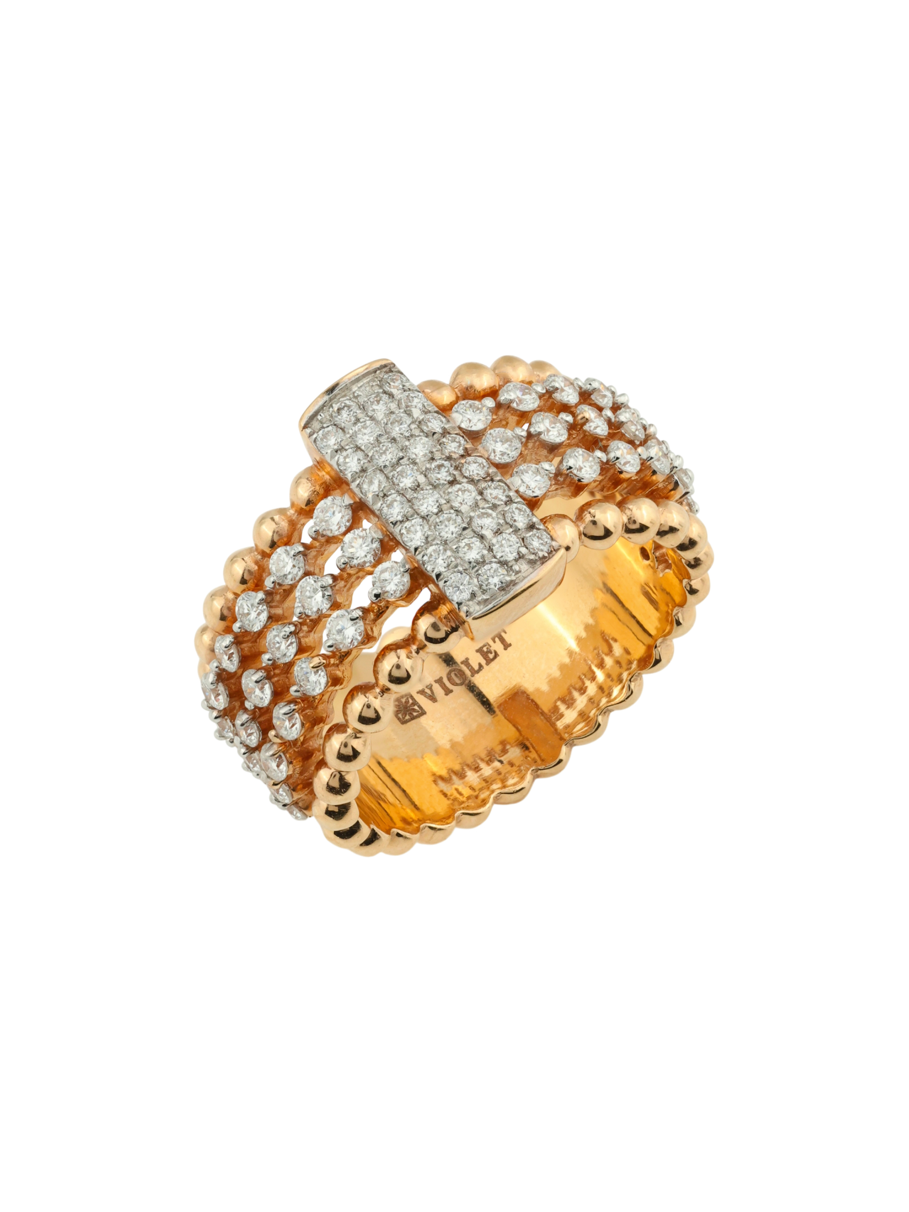 В качестве вставок использованы 72 бриллианта классической круглой огранки. Белый цвет вставок эффектно контрастирует с красным золотом, усиливая блеск и создавая игру света при каждом движении руки. Это массивное и статусное украшение универсально в своем применении — оно подходит как для женщин, так и для мужчин, предпочитающих выразительные ювелирные изделия.
