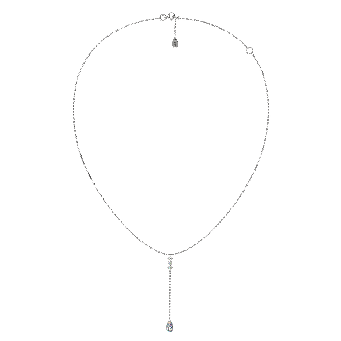 Дизайн модели подчеркивает грацию и изящество линий. Центральным акцентом композиции выступает вертикальная подвеска, инкрустированная 40 безупречными бриллиантами круглой формы. Белый цвет вставок гармонично дополняет холодный оттенок металла, создавая целостный и выразительный образ. Благодаря универсальному дизайну это колье станет достойным дополнением к образу как для женщин, так и для мужчин, подчеркивая индивидуальность и статус своего владельца.