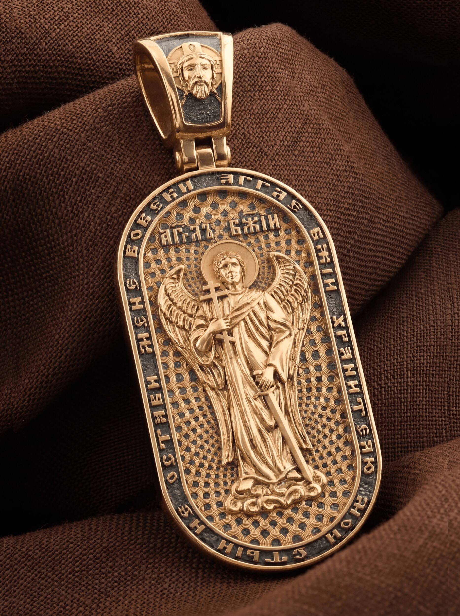 Основой композиции оборотной стороны является изображение Ангела Хранителя, который неотступно находится рядом с человеком, помогая, оберегая и наставляя его, а после смерти сопровождает его душу через мытарства. По контуру написана молитва: «Ангел Божий, хранителю мой святый, не остави мене вовеки». На кулонном кольце изображен Спас Нерукотворный — Символ вочеловечившегося Божества.