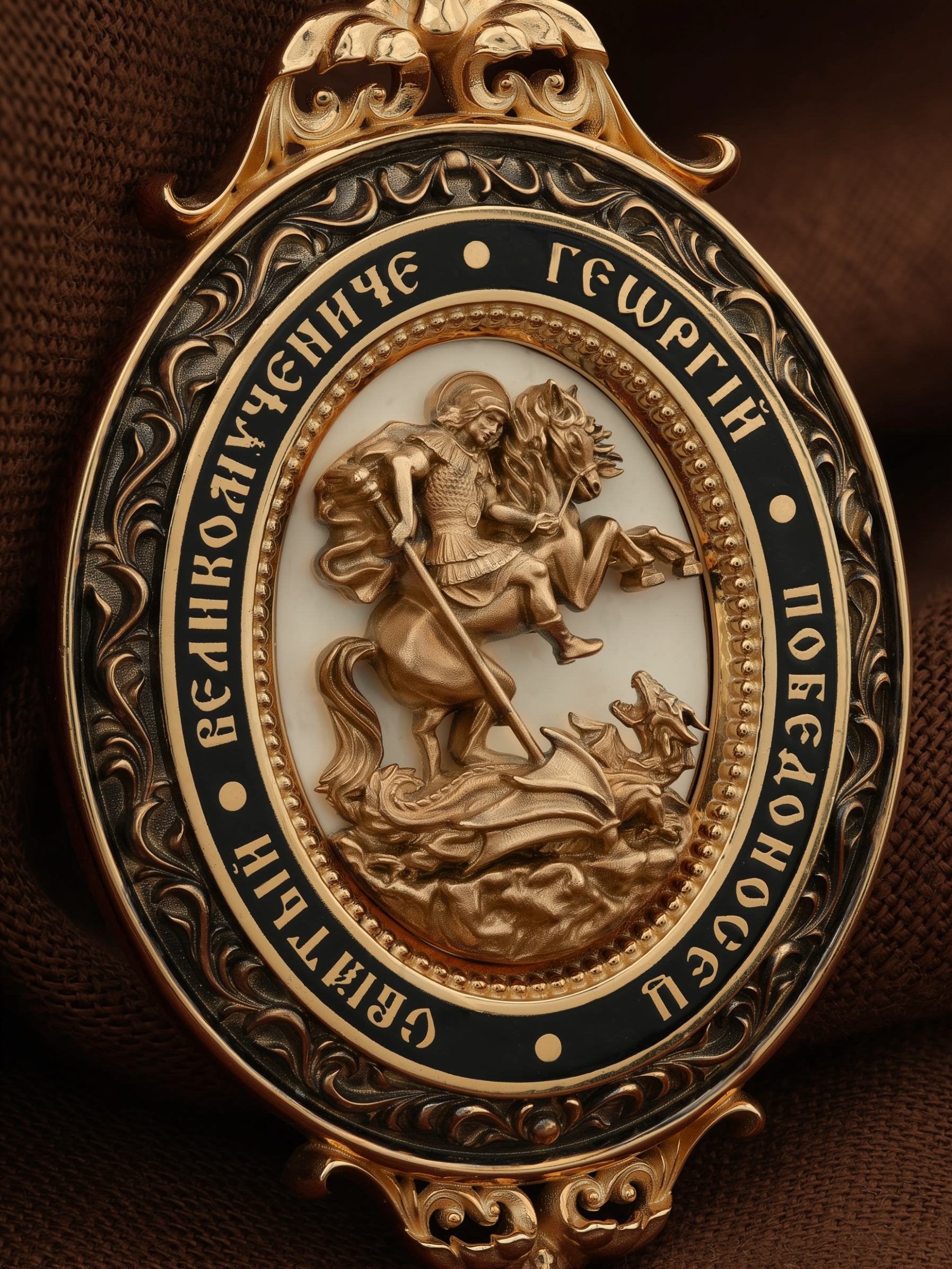 Молитва перед иконой Георгия Победоносца поможет защититься от врагов, одержать победу в сражении (военном, спортивном, духовной брани с дьяволом), содействие в установлении мира между членами семьи, избавиться от телесного недуга. На кулонном кольце изображен Спас Нерукотворный — Символ вочеловечившегося Божества и шестикрылый Серафим — самый приближенный к Господу Ангел.